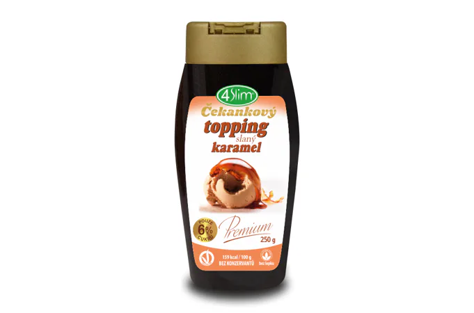 Tekutá poleva z čakankového extraktu s príchuťou karamelu, so sladidlami. Čakankový topping 4slim, to je sladká Low Carb poleva, ktorá sa môže pýšiť nízkym obsahom cukru a tuku na rozdiel od iných toppingov. Je úplne bez lepku, bez laktózy, bez konzervačných látok, s vysokým obsahom vlákniny a so zníženou energetickou hodnotou. Preto je vhodná pre všetky druhy diét.