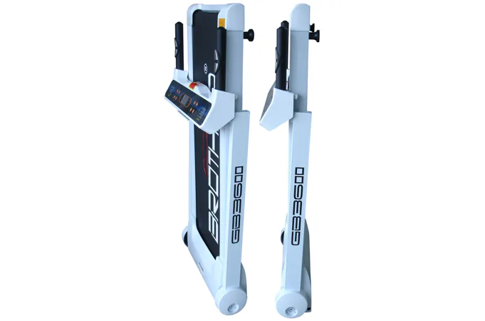 Pás se dá buď sklopit do svislé polohy při uvolnění a otočení madel do svislé polohy pak zabírá prostor 68 x 20 cm při výšce 135 cm nebo se dá na otočných kolečkách zasunout pod gauč nebo pod postel ve vodorovné poloze. Na 6 bodech odpružený polyuretanový pás o rozměru 108 x 40 cm. Rukojeti na ovládacím panelu jsou vybaveny snímačem tepové frekvence.
