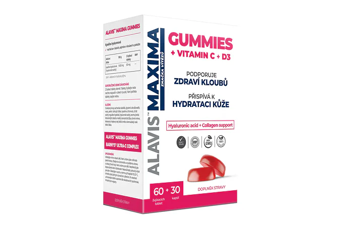ALAVIS MAXIMA Gummies sú doplnkom stravy, ktorý obsahuje kyselinu hyalurónovú a vitamíny C a D3. Tieto látky ovplyvňujú vlastnosti kĺbovej tekutiny a hydratáciu spojivových tkanív kĺbových chrupaviek a kože. Súčasne výrazne znižujú hrubosť kože a hĺbku vrások.
