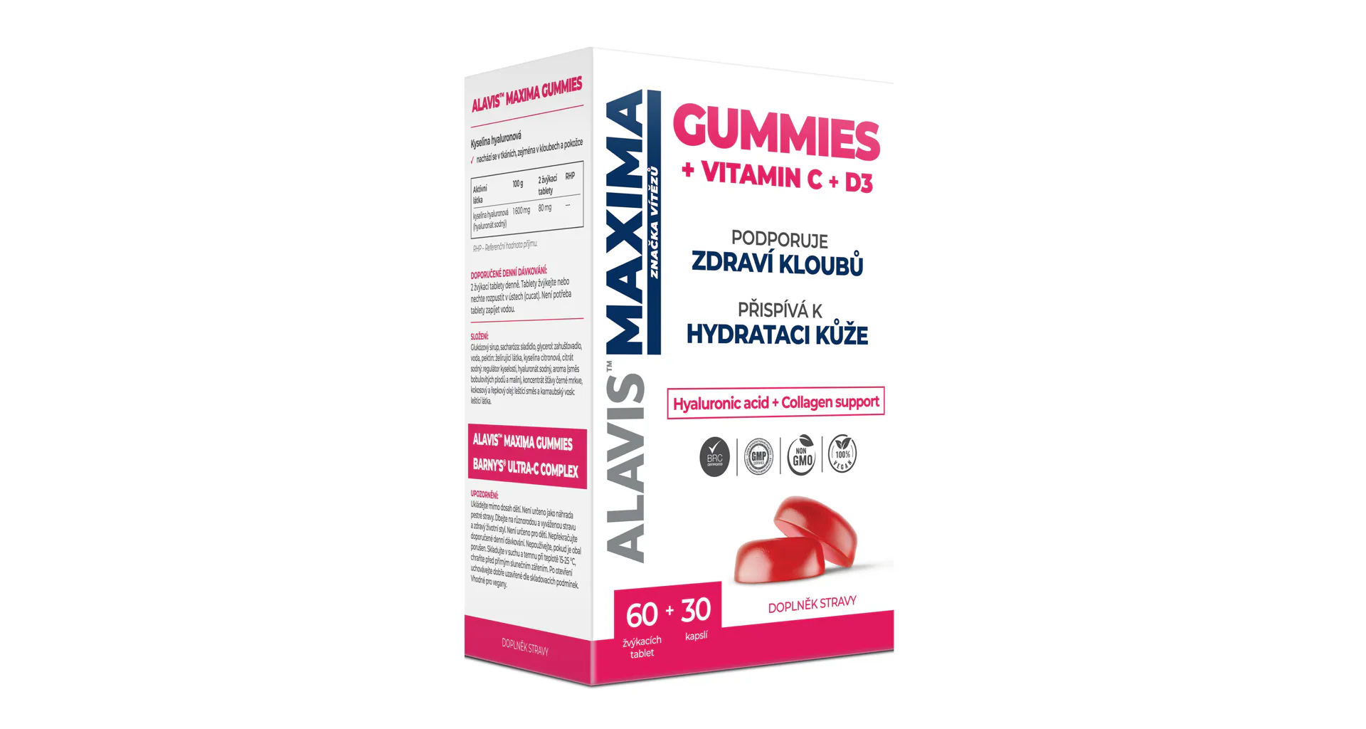 ALAVIS MAXIMA Gummies 60 tabliet + 30 kapsúl obsahuje 60 žuvacích tabliet ALAVIS MAXIMA Gummies a 30 kapsúl BARNYS® ULTRA-C COMPLEX.