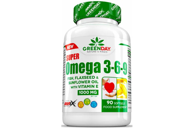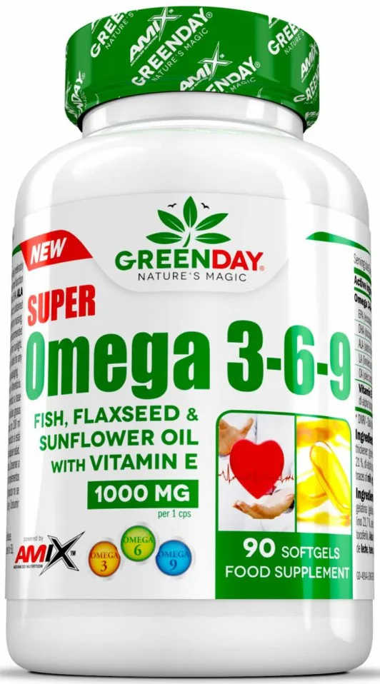 GreenDay® Super Omega 3-6-9 obsahuje extrakt z rybieho, slnečnicového a ľanového oleja v mäkkej želatínovej kapsuli, ktoré sú zdrojom nenasýtených mastných kyselín.