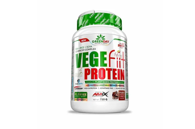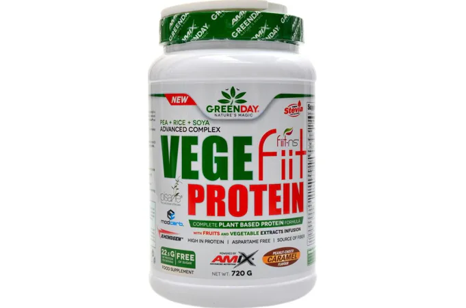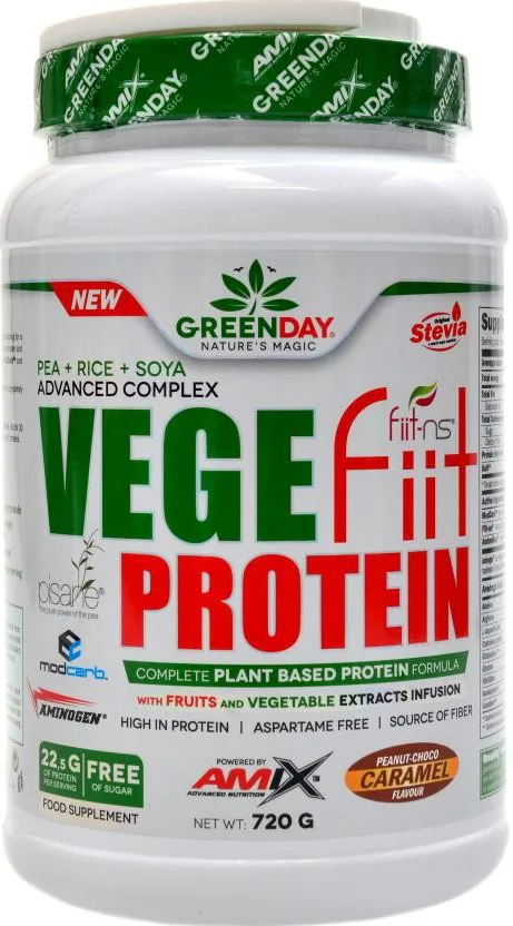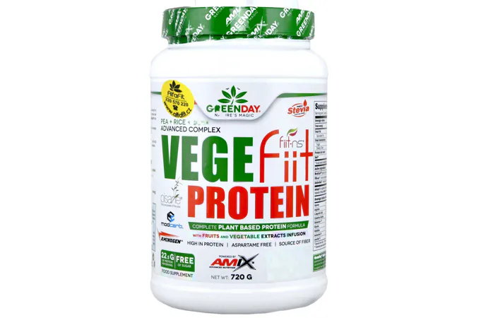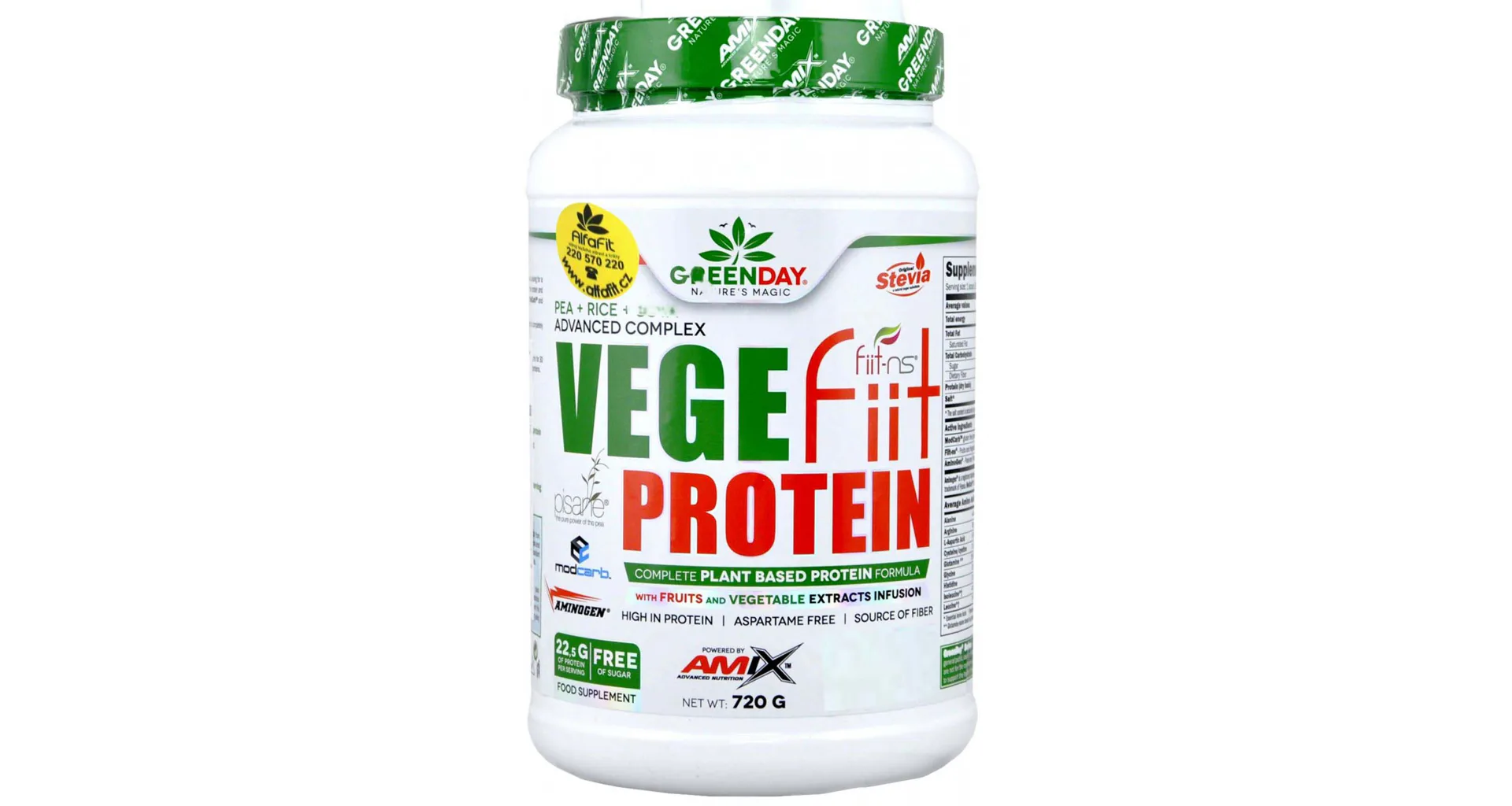 GreenDay® Vegefiit Protein je perfektné riešenie pre každého, kto hľadá bielkovinový produkt rastlinného pôvodu. Skladá sa z hrachového bielkovinového izolátu Pisane®, rýžového proteínu a sójového proteínu obohaceného o proteázové enzymy AminoGen®, viaczrnný matrix ModCarb™ a ovocno-zeleninový komplex Fiit-ns®.