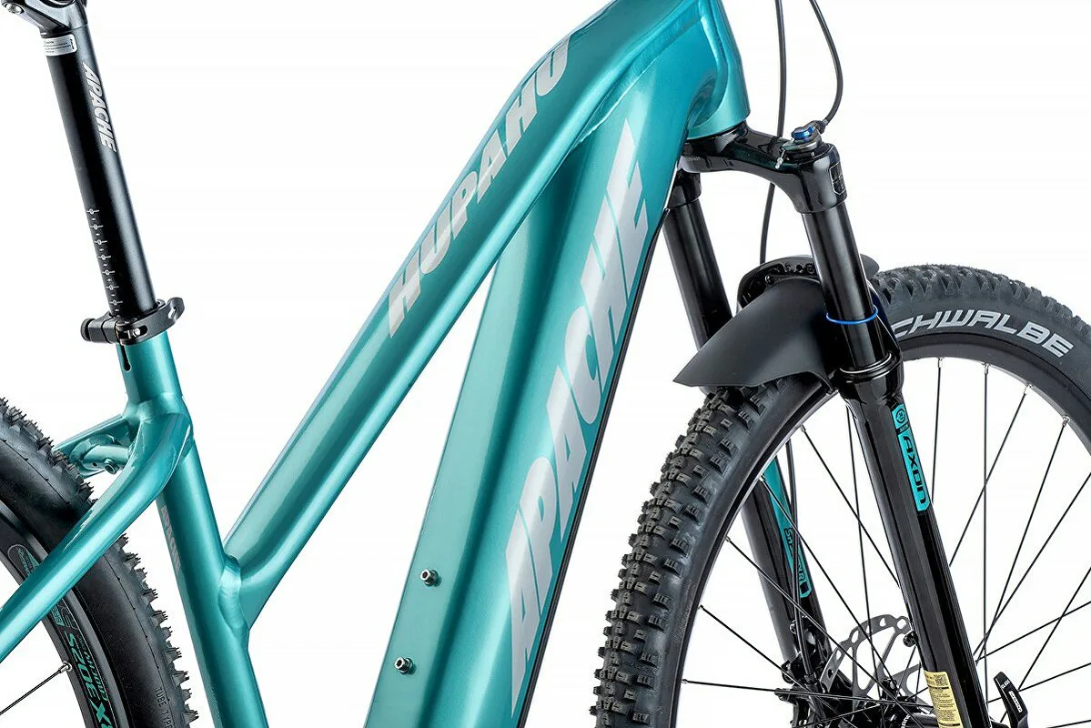 APACHE Hupahu 2 lady Bosch CX je horské elektrokolo vhodné nejen pro dámy. Hupahu lady je e-bike s plně integrovanou baterií v rámu kola, přídavnou baterií pro navýšení dojezdu, sportovním designem a odpruženou přední vidlicí. Kapacita baterie je 20,1 Ah (750 Wh) + 6,9 Ah (250 Wh) v přídavné baterii.