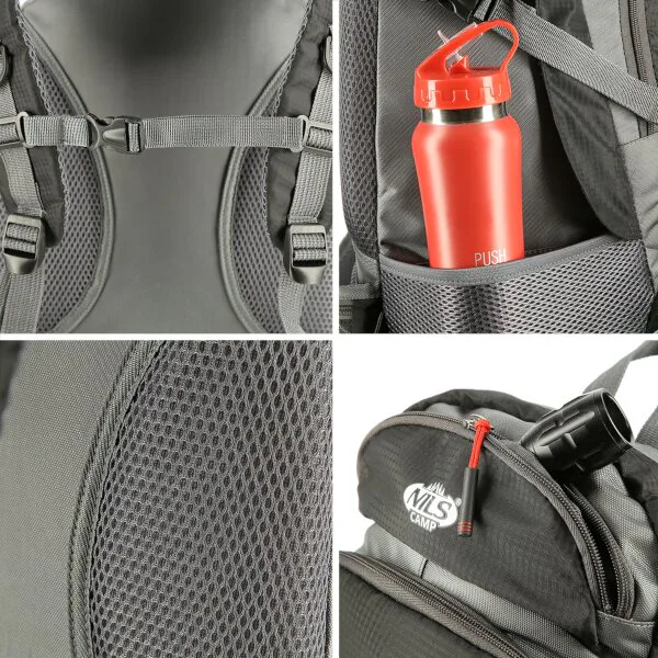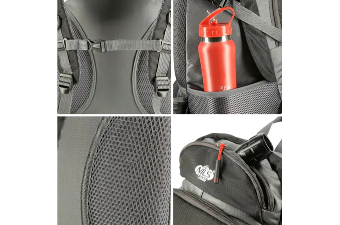 Polstrovaná zadná strana zo sieťoviny je vybavená systémom NILS Vent, ktorý zaisťuje cirkuláciu vzduchu medzi batohom a chrbtom, tým sa znižuje ich potenie. Pohodlné, polstrované popruhy sú dĺžkovo nastaviteľné. Na hornej strane nájdeme pútko na prenášanie alebo zavesenie batohu. Pre lepšie rozloženie nosnosti je batoh Arsaken vybavený hrudným a bedrovým pásom.