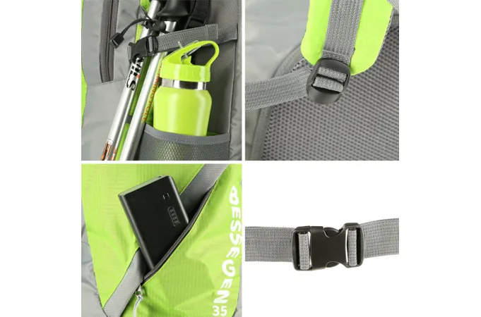 Predná komora je určená na menšie predmety ako je napríklad peňaženka alebo mobilný telefón. Po stranách batohu sa nachádzajú 2 priehradky zo sieťoviny, ktoré pojmú napríklad fľašu s vodou, dlhšie predmety je možné dodatočne zafixovať popruhmi s prackou. Pútka po stranách slúži na uchytenie turistických palíc. Posledné 2 vrecká na zips sa nachádzajú na bedrovom popruhu a dajú sa využiť napríklad na mince, alebo kľúče od domu.