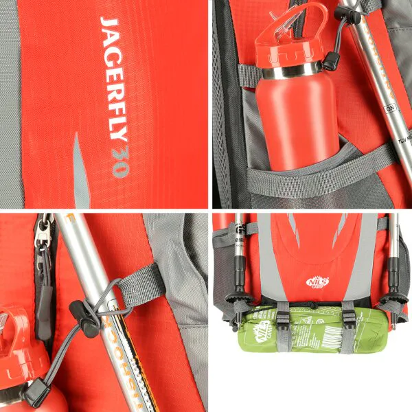 Polstrovaná zadná strana zo sieťoviny je vybavená systémom NILS Vent, ktorý zaisťuje cirkuláciu vzduchu medzi batohom a chrbtom, tým sa znižuje ich potenie. Pohodlné, polstrované popruhy sú dĺžkovo nastaviteľné. Na hornej strane nájdeme pohodlnú rukoväť na prenášanie batohu v ruke a pútko na zavesenie batohu. Pre lepšie rozloženie nosnosti je batoh Jagerfly vybavený hrudným a bedrovým pásom.