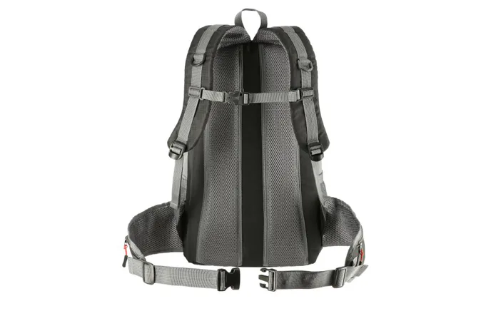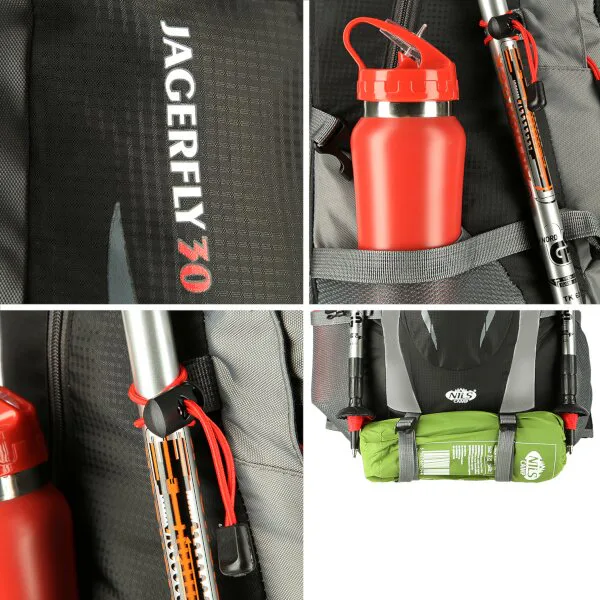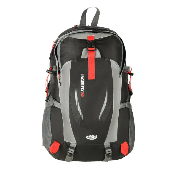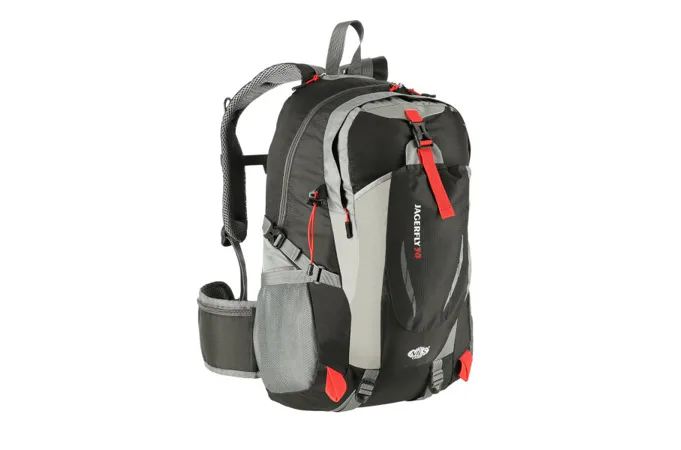 Polstrovaná zadná strana zo sieťoviny je vybavená systémom NILS Vent, ktorý zaisťuje cirkuláciu vzduchu medzi batohom a chrbtom, tým sa znižuje ich potenie. Pohodlné, polstrované popruhy sú dĺžkovo nastaviteľné. Na hornej strane nájdeme pohodlnú rukoväť na prenášanie batohu v ruke a pútko na zavesenie batohu. Pre lepšie rozloženie nosnosti je batoh Jagerfly vybavený hrudným a bedrovým pásom.
