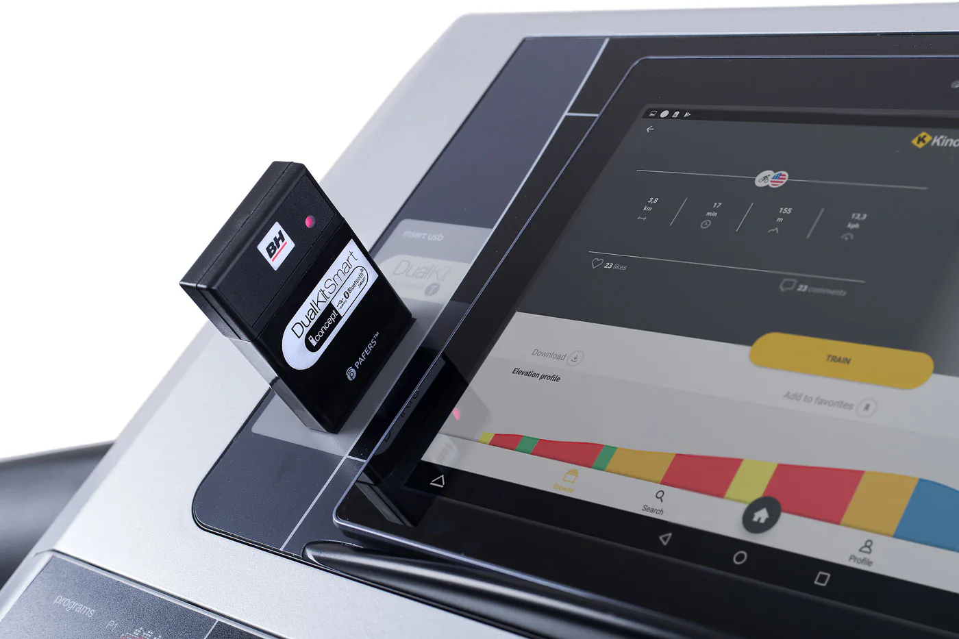 BH FITNESS DUAL KIT DI22 je zariadenie vytvorené pre bežecké pásy, rotopédy aj eliptické trenažéry s technológiou I.Concept a umožňuje prepojenie Vášho telefónu alebo tabletu pomocou Bluetooth 4.0.