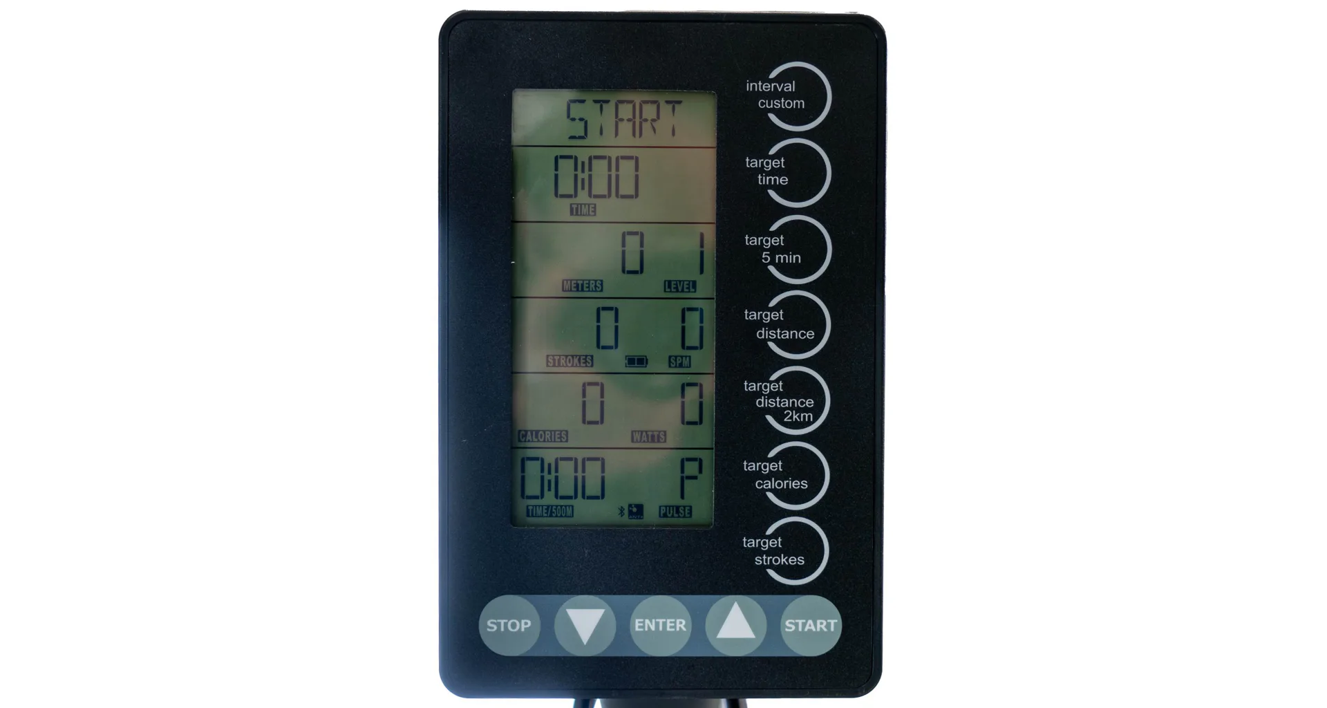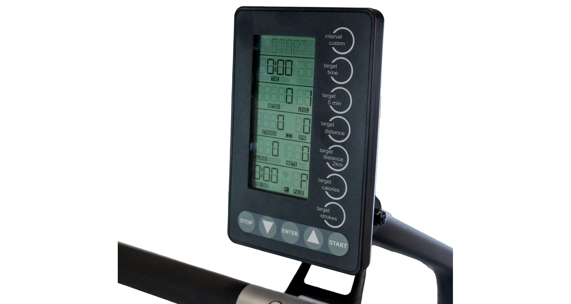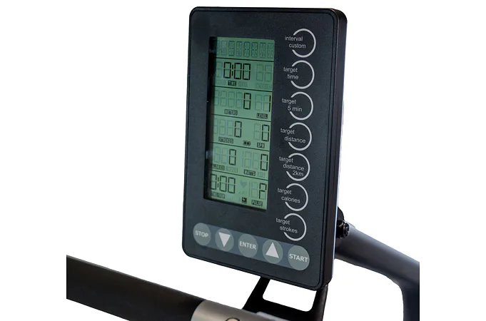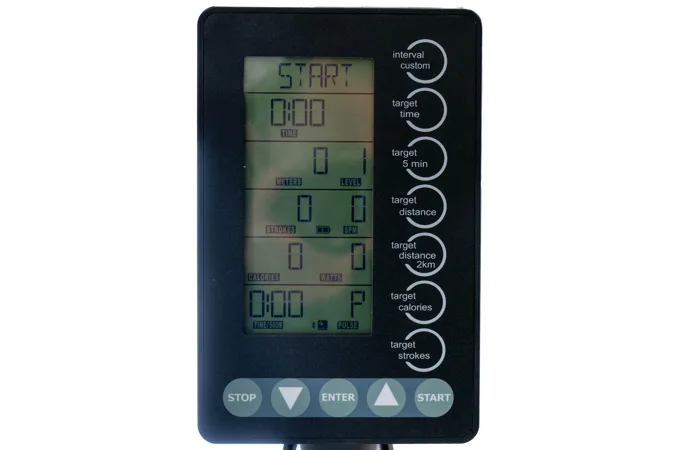 Přístroj je vybaven samonapájecím 5,5" LCD monitorem, který přehledně zobrazuje všechny důležité údaje jako čas, vzdálenost, záběry za minutu (SPM), kalorie, watty a tepovou frekvenci. K tomu navíc nabízí Bluetooth a ANT+ konektivitu, takže ho snadno spárujete s chytrými aplikacemi, díky kterým lze můžete sledovat svůj pokrok.