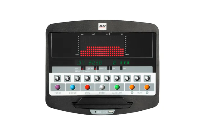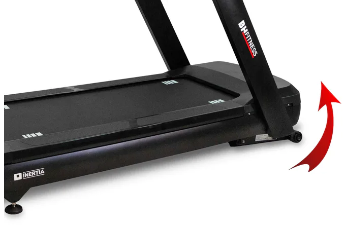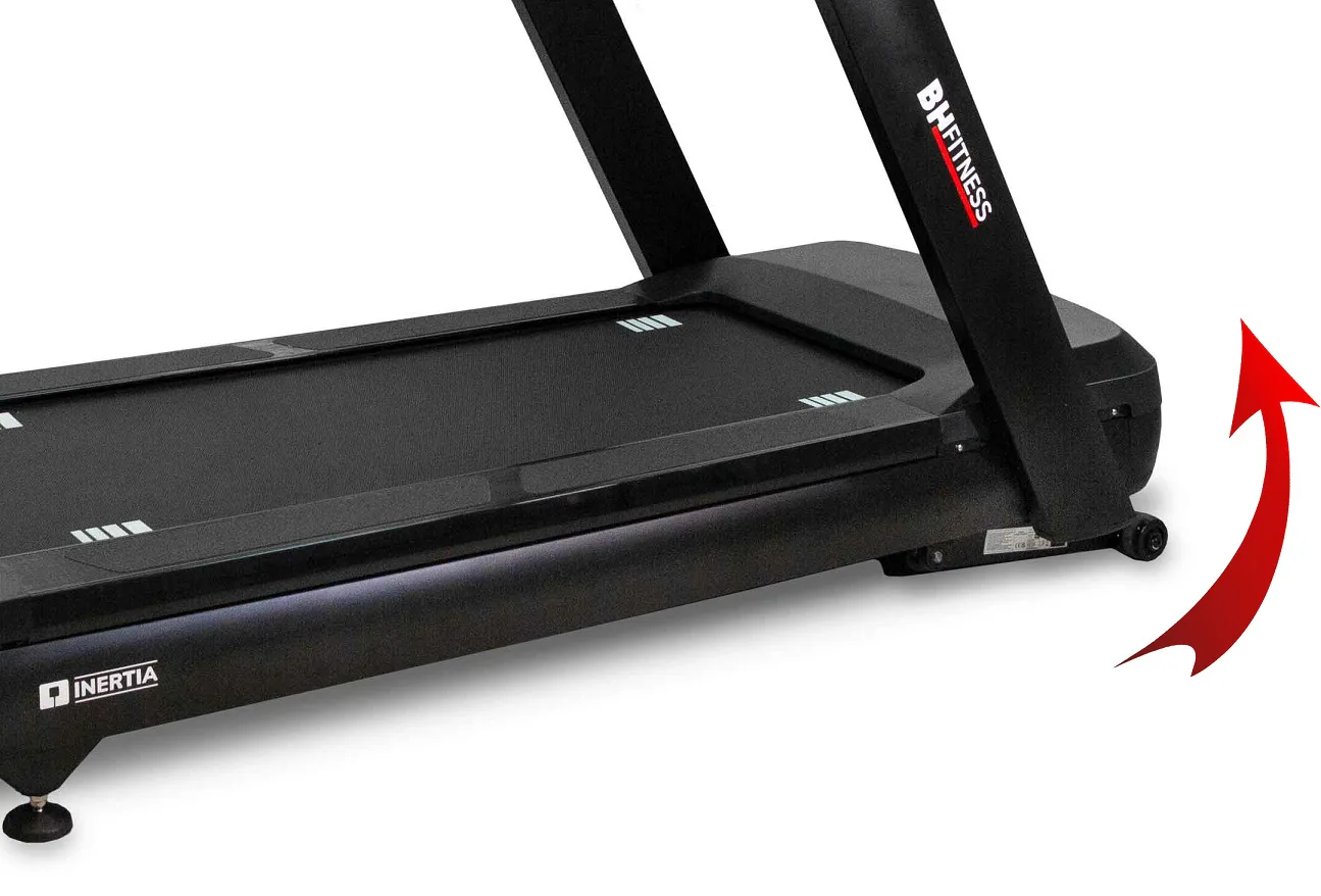 Běžecký pás BH Fitness INERTIA G688 LED disponuje moderním počítačem s Bluetooth a snadným ovladáním, držáky na lahve, senzory pro měření tepové frekvence a transportními kolečky.