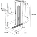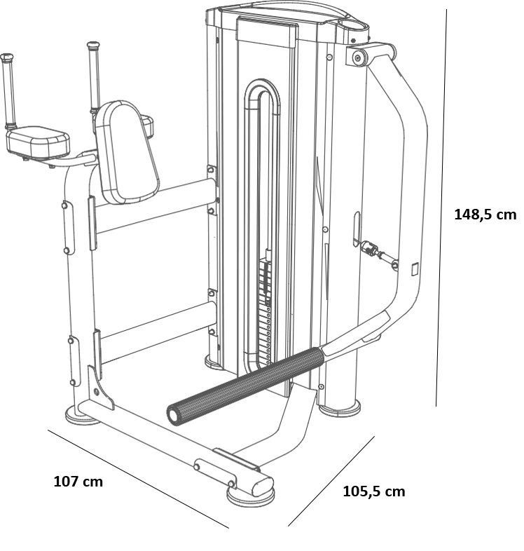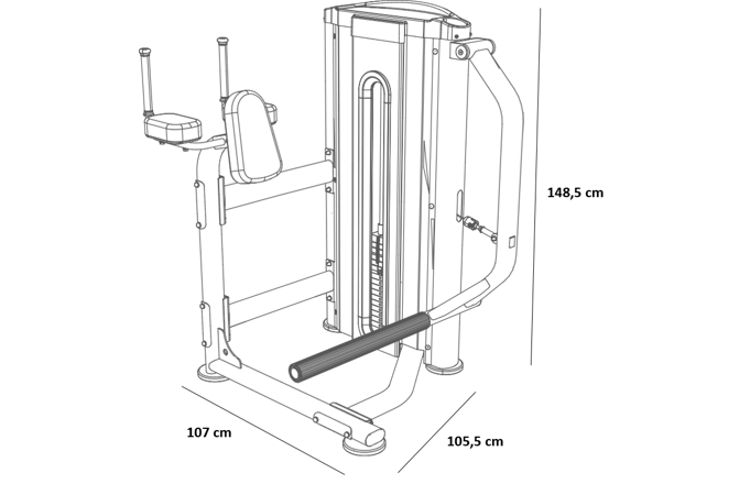 Posilovač stehen a hýždí L330 se rozkládá na půdorysu o rozměrech (d x š x v) 107 cm, 105 cm a 148 cm, nezabere vám tedy moc prostoru a stále zůstane dostatek místa i na další stroje.