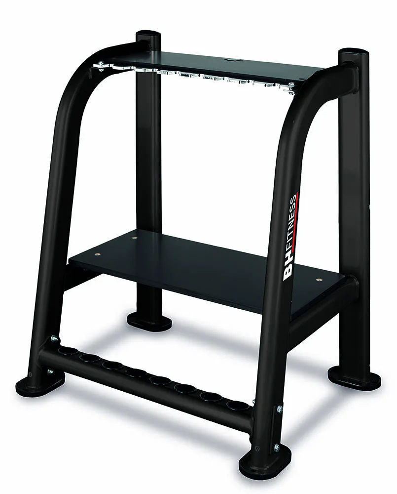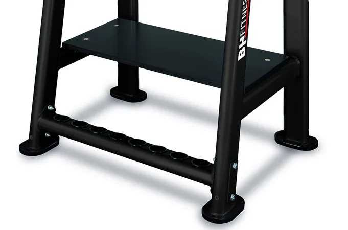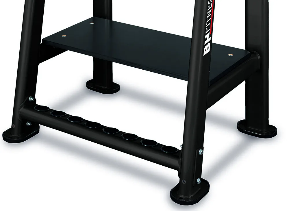 Stojan na olympijské BH Fitness L870BB disponuje 8 držáky na osy s o průměru 50 mm. Díky tomu můžete s minimálními prostorovými nároky elegantně vyřešit skladování pro většinu os. Masivní kovový držák je stabilní, z masivní oceli s černým elegantním designem. Odkládací pultík na uzávěry na činku. Podlahu před poškrábáním chrání praktické gumové nohy.