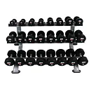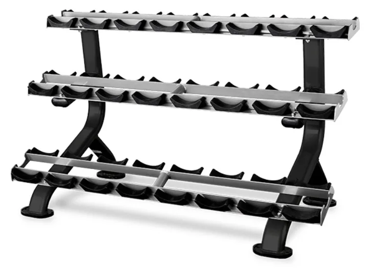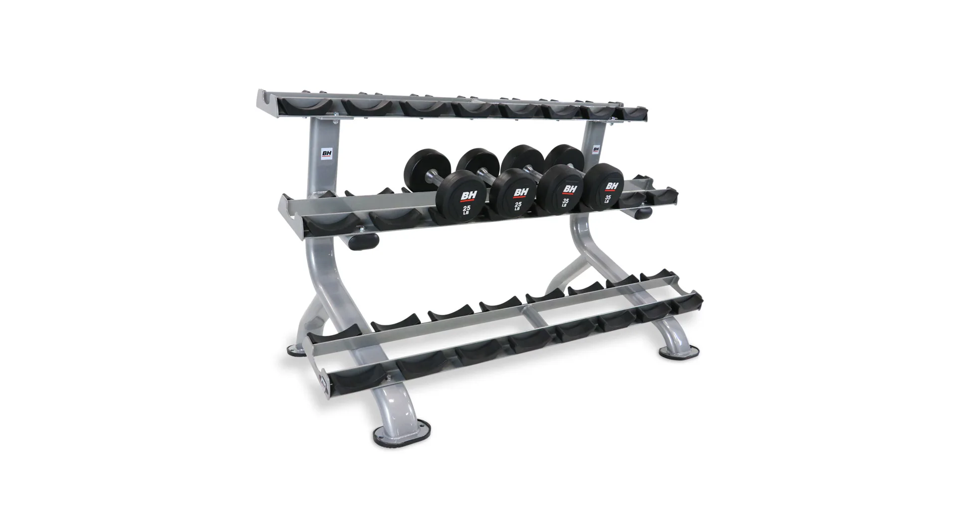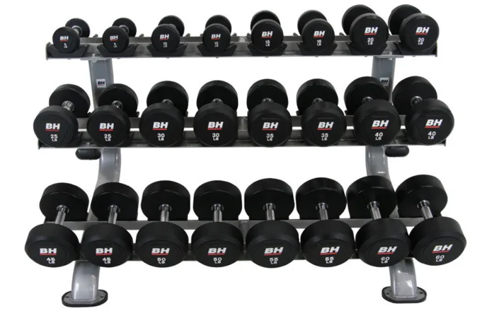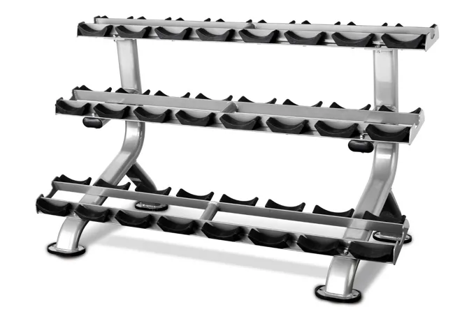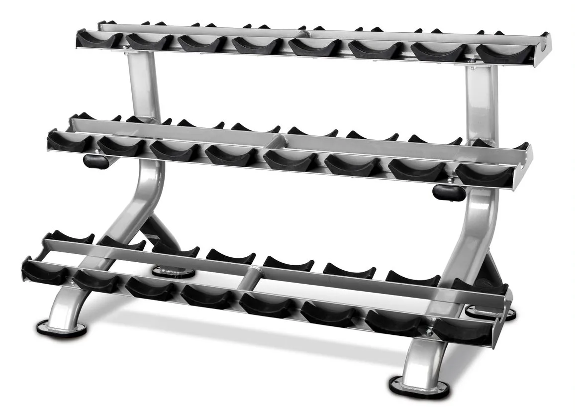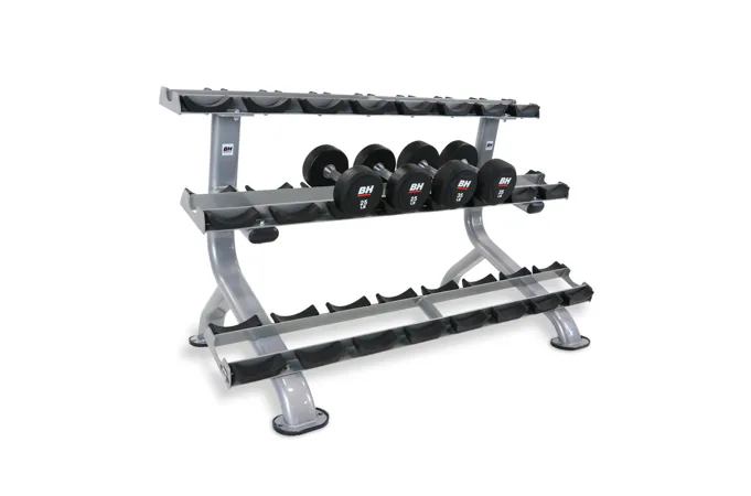 Profesionální stojan na jednoruční činky BH FITNESS L875 umožňuje bezpečné a pohodlné uložení jednoručních čínek. Police má tři police a lze na něj odložit až 12 párů činek. Plochy pro odložení činek jsou opatřeny ochrannou gumou chránící stojan i činky. Podlahu před poškrábáním chrání praktické gumové nohy.