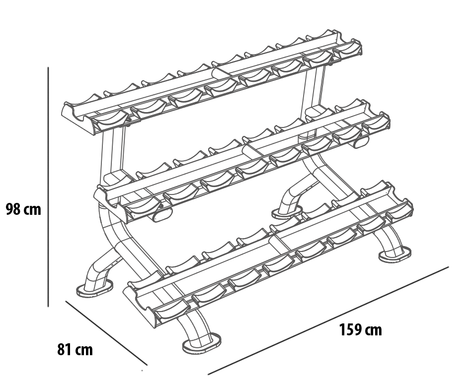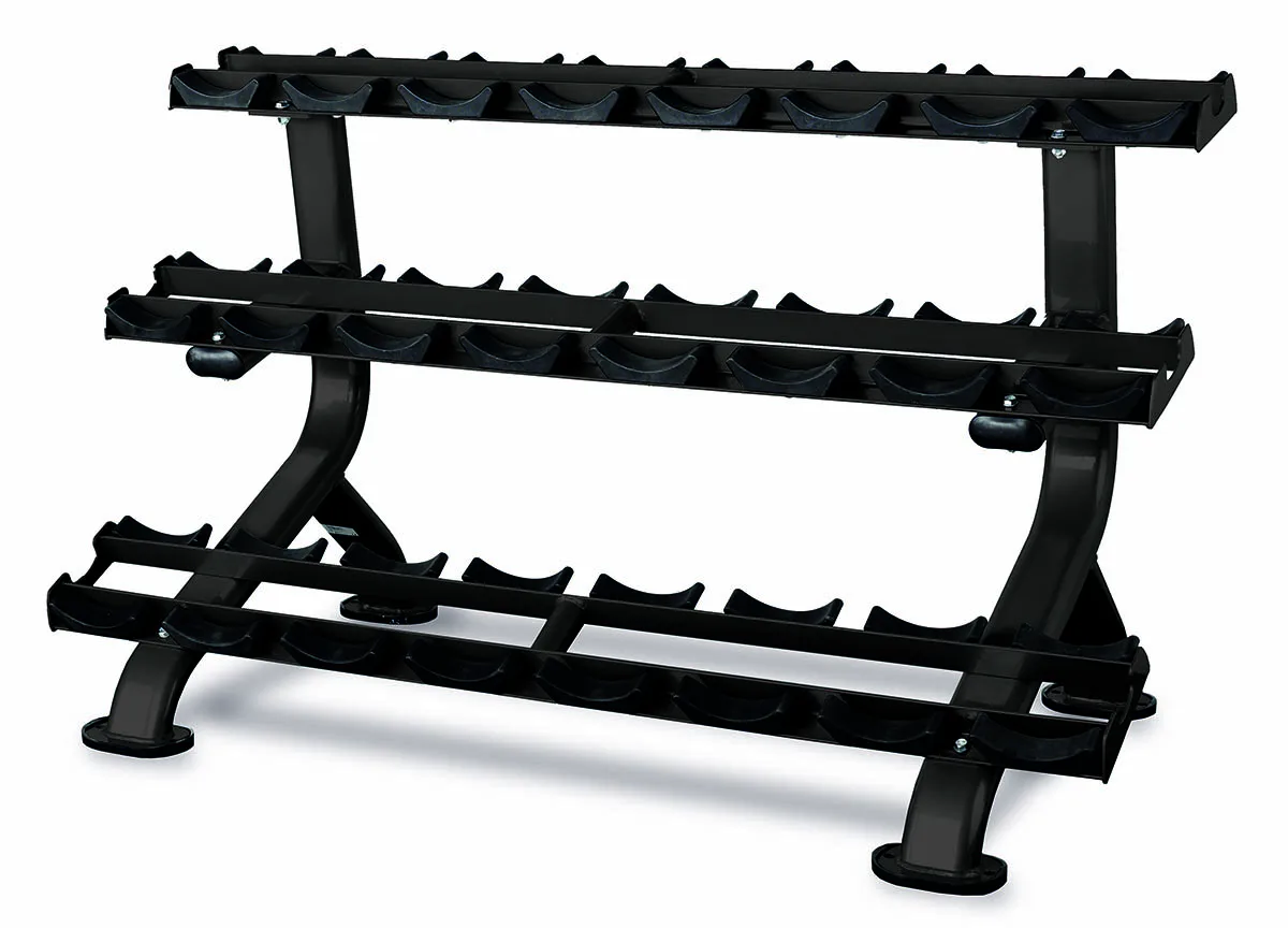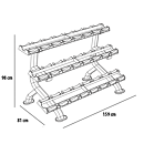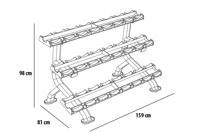 Profesionální stojan na jednoruční činky BH FITNESS L875BB umožňuje bezpečné a pohodlné uložení jednoručních činek. Police má tři police a lze na něj odložit až 12 párů činek. Plochy pro odložení činek jsou opatřeny ochrannou gumou chránící stojan i činky. Podlahu před poškrábáním chrání praktické gumové nohy.