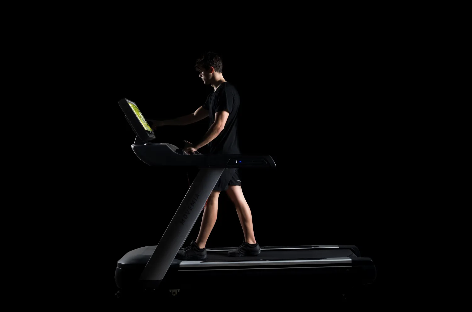 Běžecký pás BH FITNESS Movemia Extra Inclination TR1000R disponuje moderním počítačem s 22" dotykovým displejem a snadným ovladáním, držáky na lahve, senzory pro měření tepové frekvence a transportními kolečky.