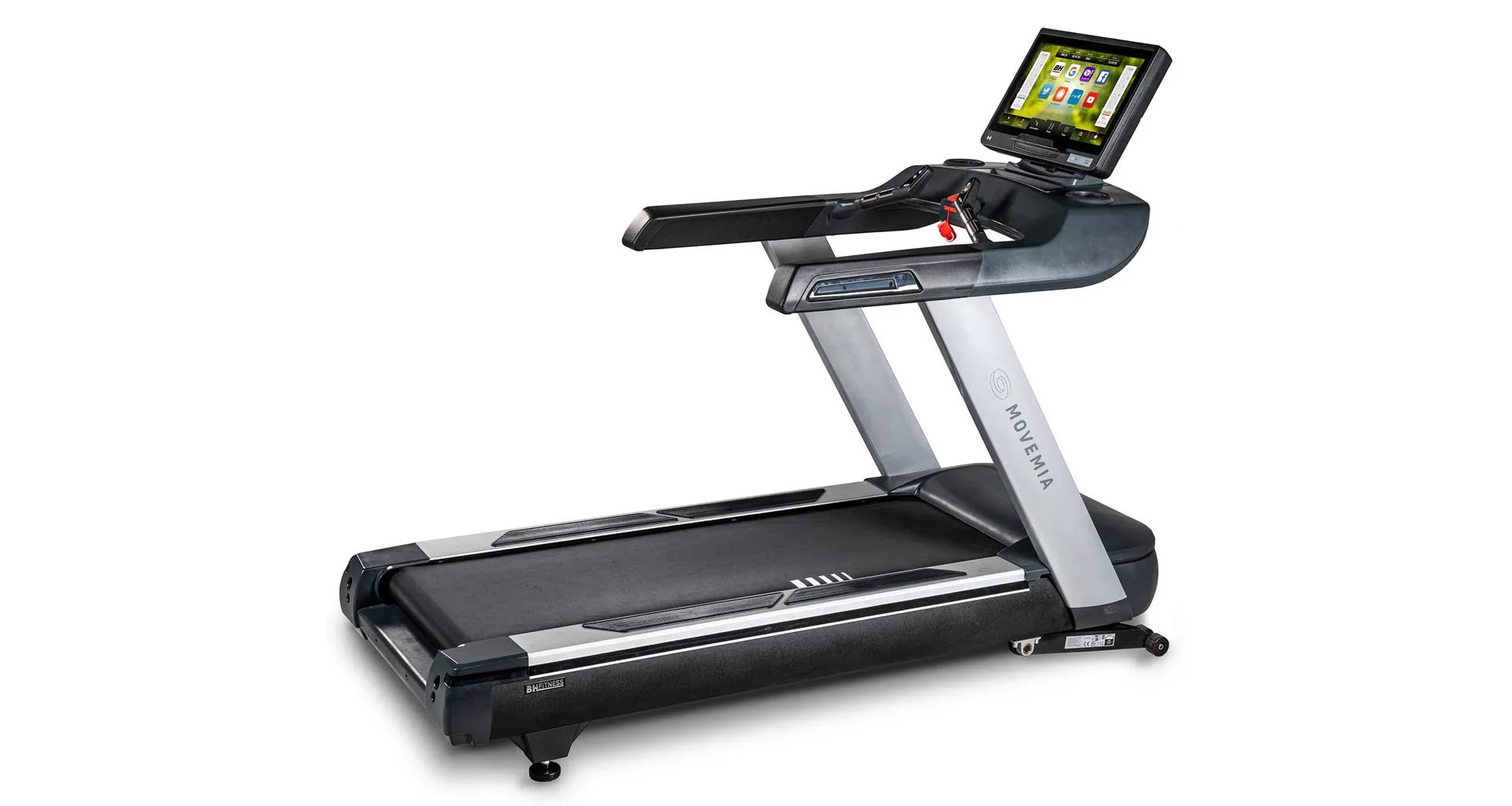 Běžecký pás BH FITNESS Movemia TR1000 SmartFocus 21" disponuje moderním počítačem s 21" dotykovým displejem a snadným ovladáním, držáky na lahve, senzory pro měření tepové frekvence a transportními kolečky.