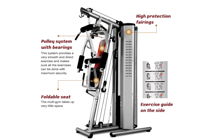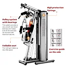 Konstrukce stroje je robusní a stabilní, doplněná kvalitním polstrováním. Všechny kladky jsou osázeny kvalitními průmyslovými ložisky s mechanismem pro dopínání. Ocelová lanka jsou potažena speciální vrstvou proti oděru, což zaručuje hladký, tichý chod a dlouhou životnost.