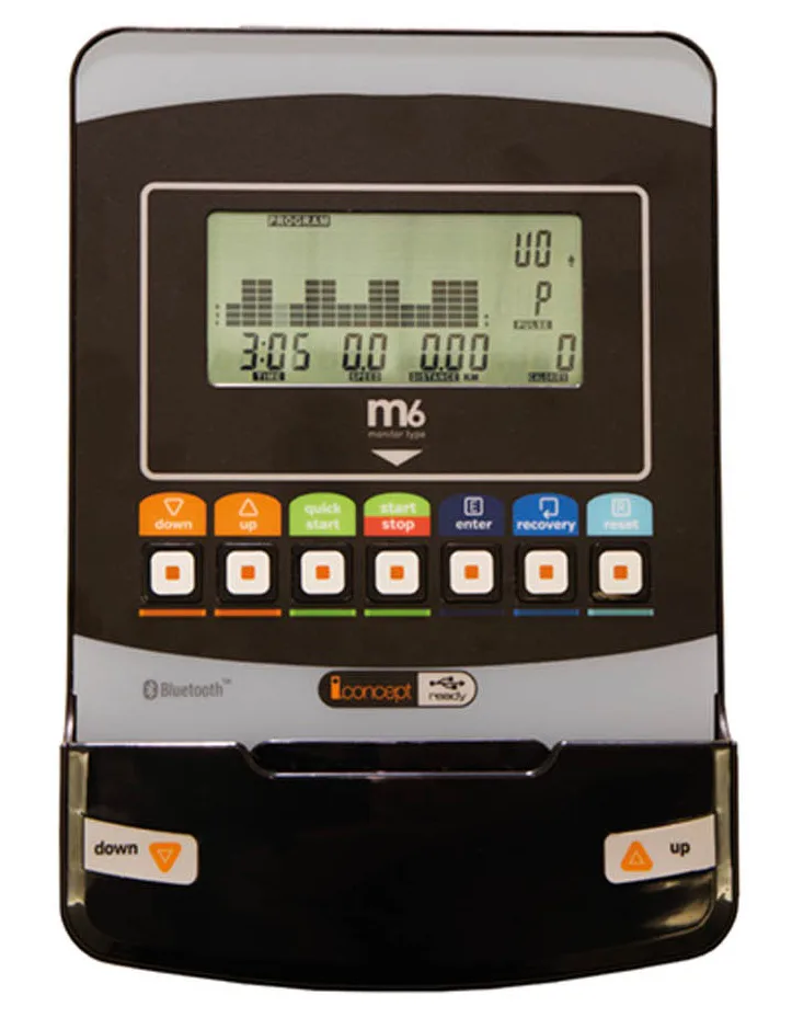 Eliptický trenažér BH Fitness NLS14 TOP DUAL je vybaven přehledným počítačem s držákem na tablet a USB portem pro připojení systému DUAL KIT, senzory na měření tepové frekvence, transportními kolečky a vyrovnávači nerovnosti.