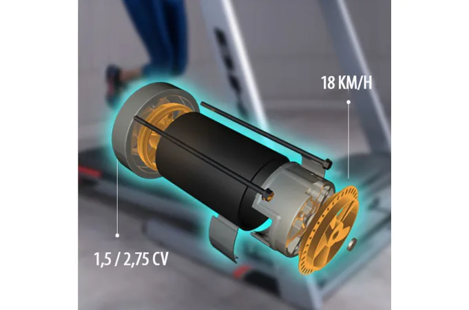 Trenažér má kvalitní značkový motor s maximálním výkonem 2,75 HP umožňujcící na pásu běhat rychlostí 1 až 18 km/h.