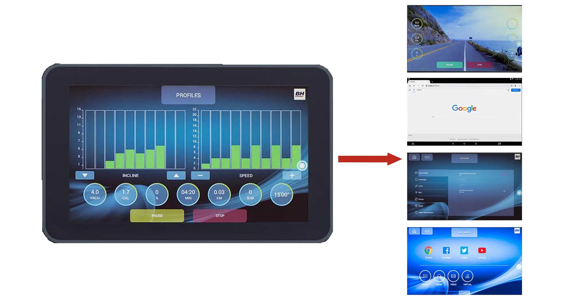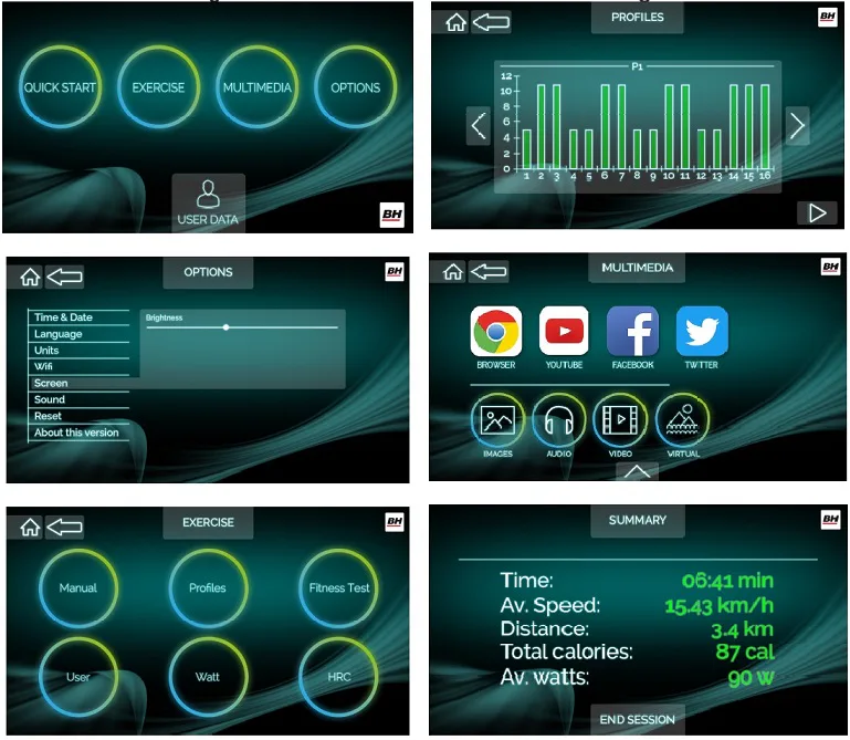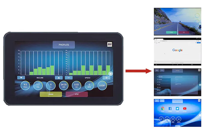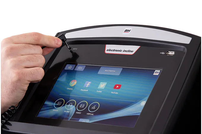 K dispozici máte komfortní dotykové TFT rozhraní s multimébii (YuiTube, prohlížeč ...) možností nastavení několika uživatelů, jejich dat, 36 přednastavených programů, HRC programy řízené tepem a uživatelsky nastavitelný program.
