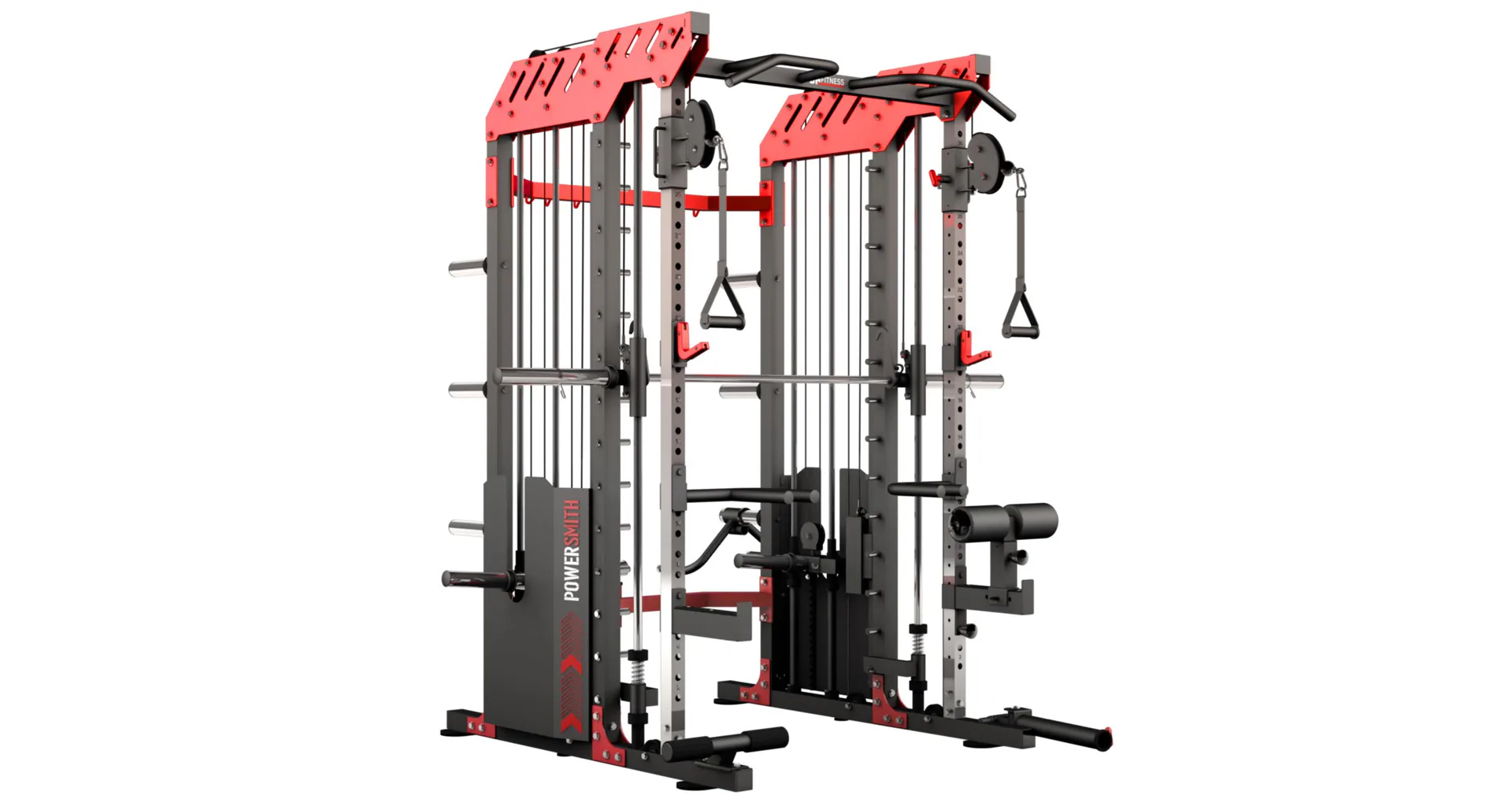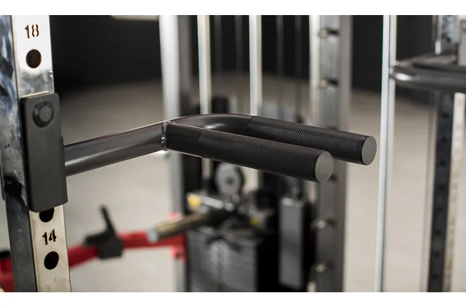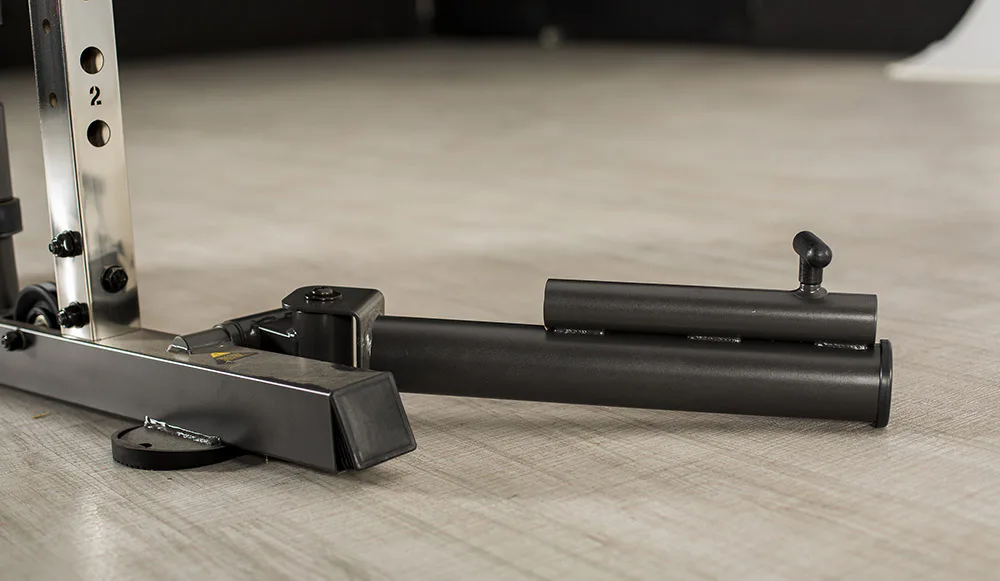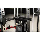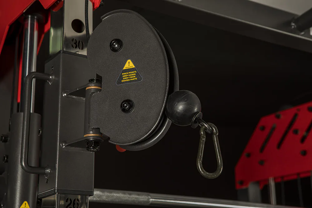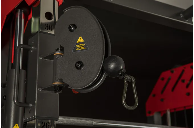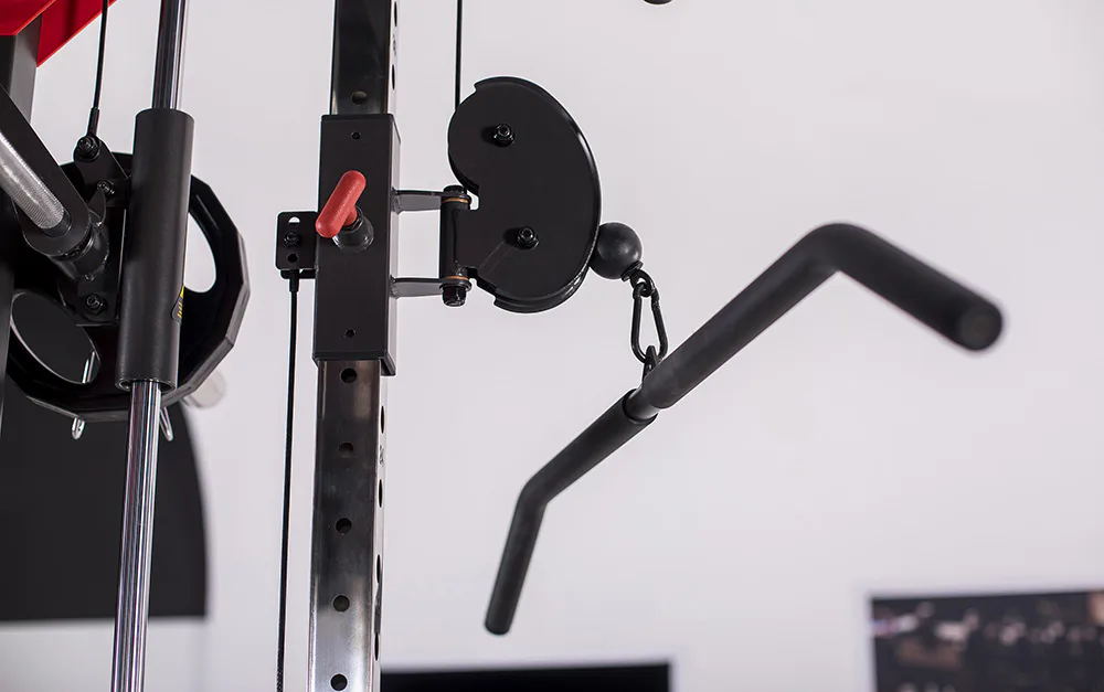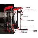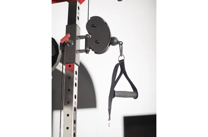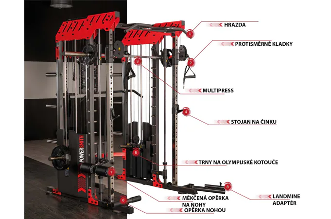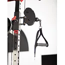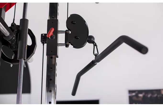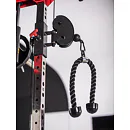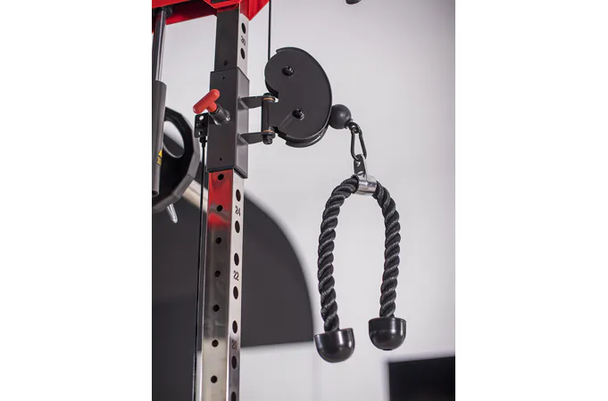 Dvě protisměrné kladky je možné polohovat v 17 výškových polohách, můžete tak procvičit většinu partií. V přední částí se nachází multipress a také stojan na velkou činku, který se dá posouvat v celé výšce stroje.