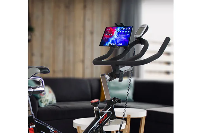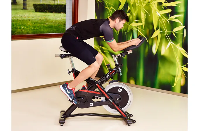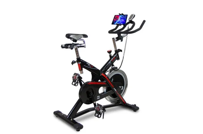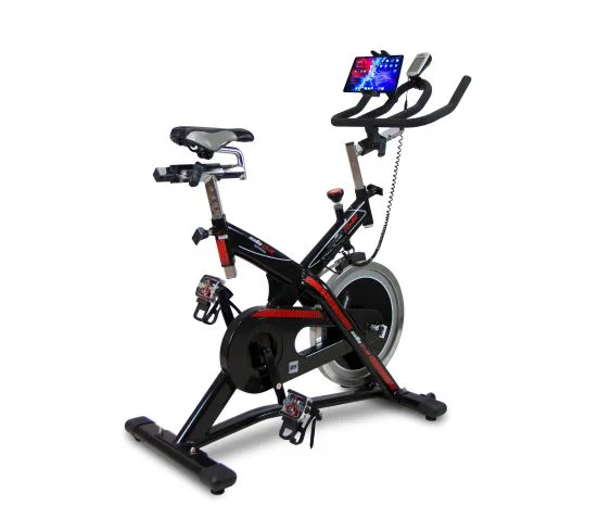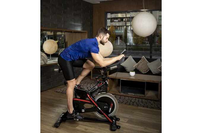 Cyklotrenažér BH Fitness SB2.6 je mimo jiné vybaven přehledným počítačem, držákem na tablet/smartphone, transportními kolečky a vyrovnávači nerovnosti.