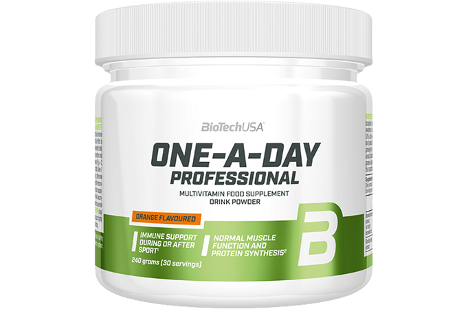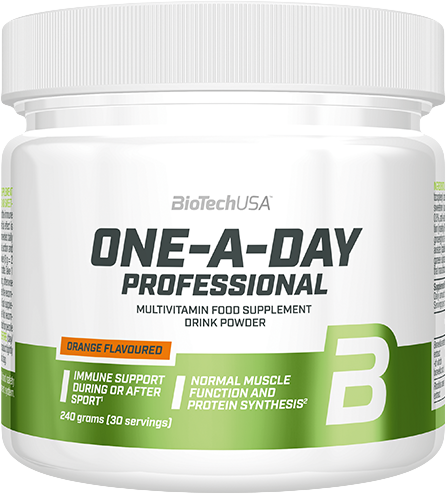 Nápoj v prášku BioTech One-A-Day Professional je určený pre amatérskych a vrcholových športovcov, ktorí žijú aktívnym životom a veľmi uvedomelo si plánujú jedálniček; venujú pozornosť každému detailu a neustále hľadajú komplexné a praktické výživové doplnky, ktoré si dokážu jednoducho zaradiť do športovo zameranej, pestrej a vyrovnanej stravy. Navyše One-A-Day Professional vo forme nápoja v prášku so zamatovou pomarančovou príchuťou obsahuje 12 druhov vitamínov, 9 druhov minerálnych látok a 5 druhov rastlinných zložiek a tak ho môžeš piť hoci cez deň, ako osviežujúci nápoj do jedla.