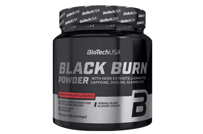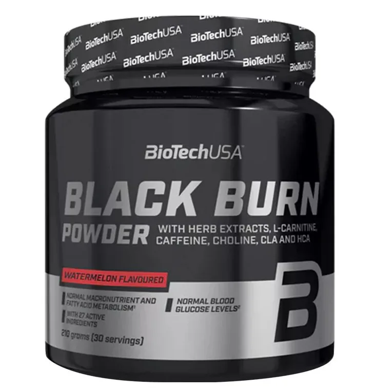 Okrem komplexu vitamínov a minerálnych látok, ktorý tvorí základ nápoja v prášku Black Burn, obsahuje aj taktiež obľúbené zložky ako L-karnitín, L-tyrozín, CLA, HCA alebo inozitol. Medzi širokospektrálnymi účinnými látkami produktu je aj 9 rôznych rastlinných extraktov, napríklad extrakty z koreňa Coleus forskohlii a z listov zeleného čaju alebo zo zelenej kávy a guarany. Posledné 3 z rastlinných extraktov slúžia aj ako prírodný zdroj kofeínu, ale nápoj je obohatený aj o pridaný bezvodý kofeín, aby ste sa mohli do tréningu pustiť s ešte väčším elánom. Jednou z výhod ochuteného nápoja v prášku Black Burn je, že obsahuje aj vlákninu inulín, rozpustnú vo vode.