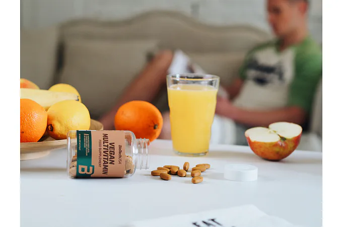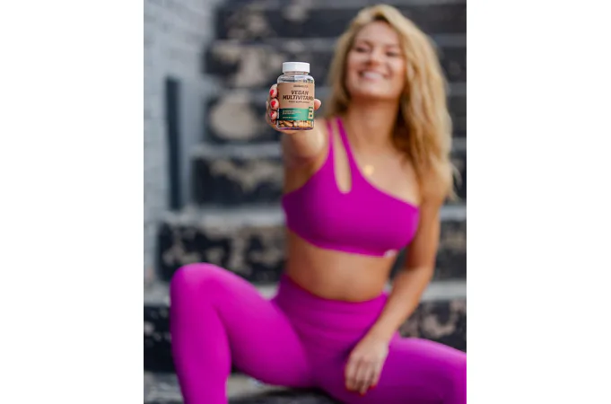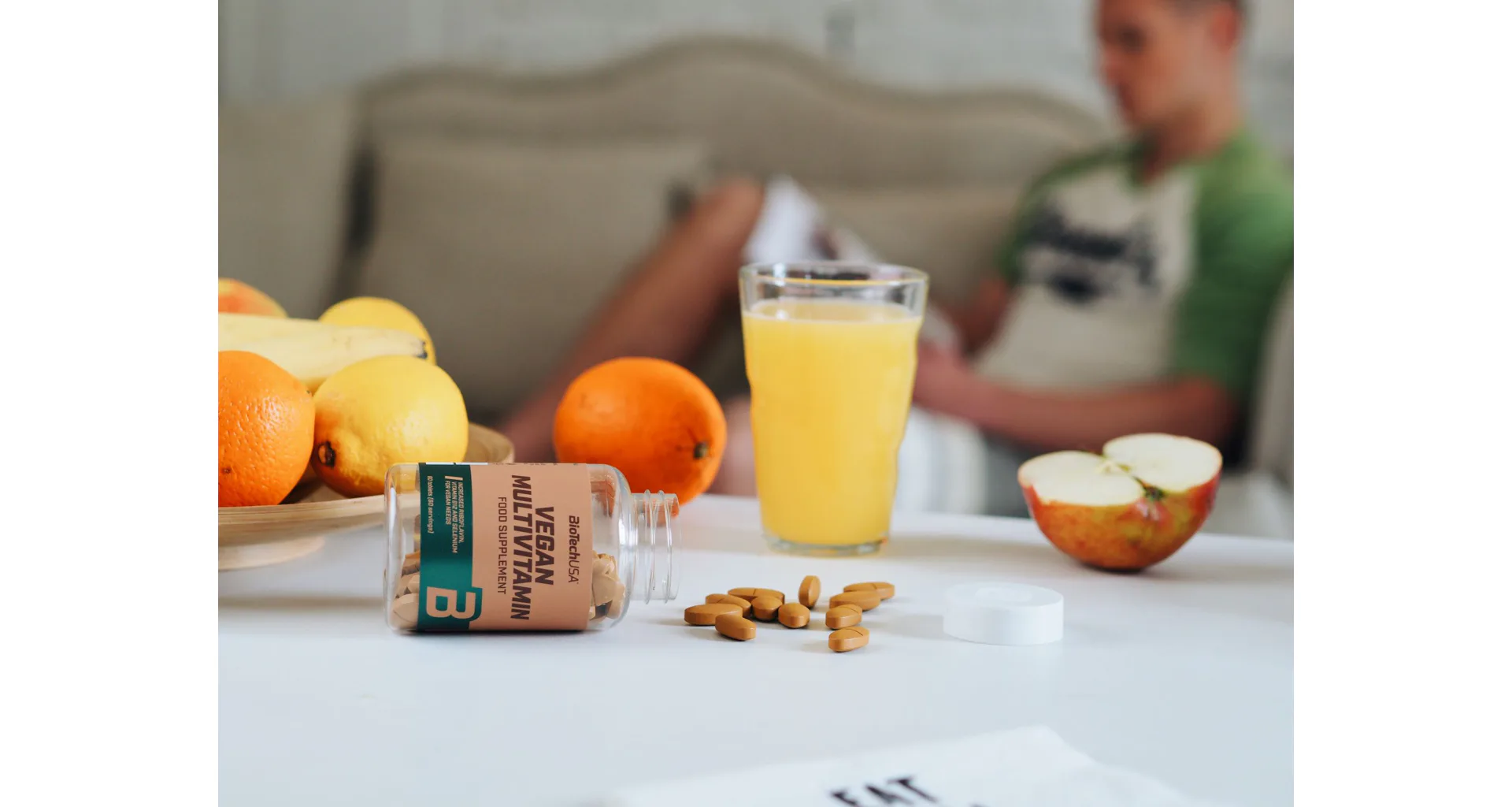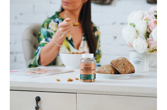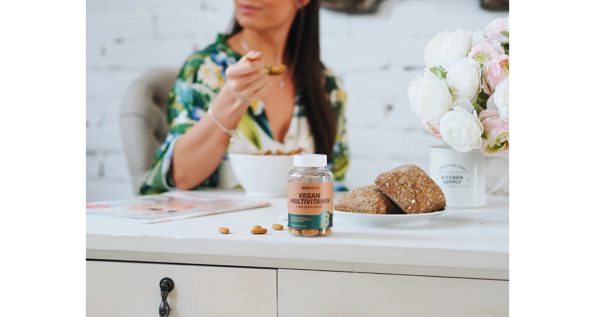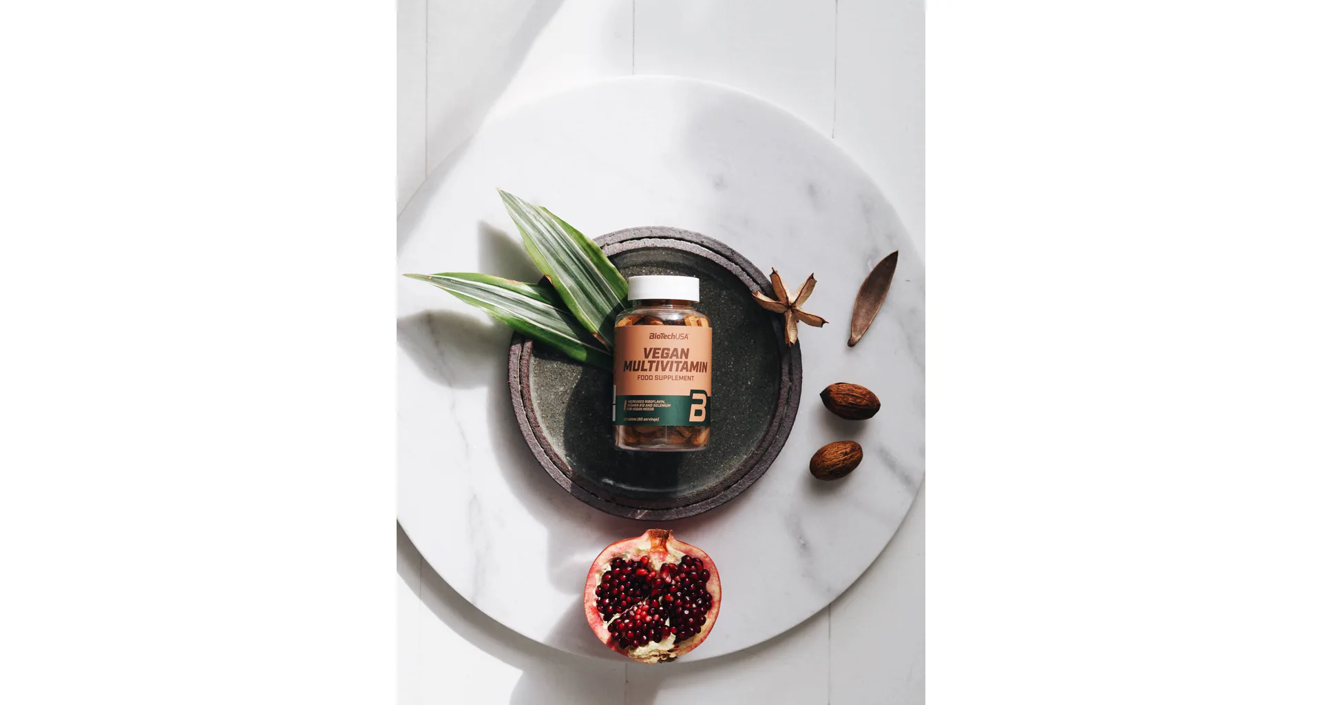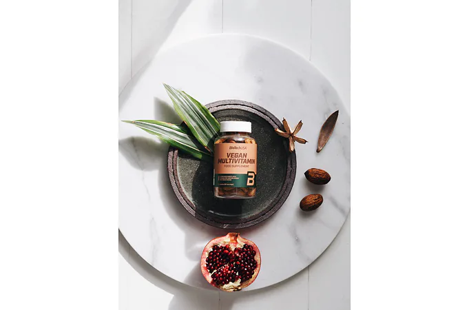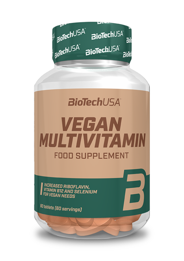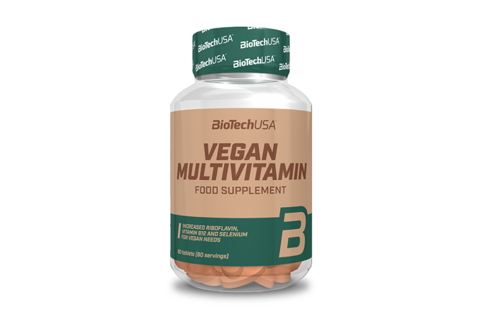 BIOTECH Vegan Multivitamín je vegánska forma multivitamínu, ktorý obsahuje 12 typov vitamínov a 10 typov minerálov a je dokonale vhodný pre vegánsku alebo vegetariánsku stravu. Okrem iného podporuje vegánske potreby zvýšeným obsahom vitamínu B2, B12 a selénu.