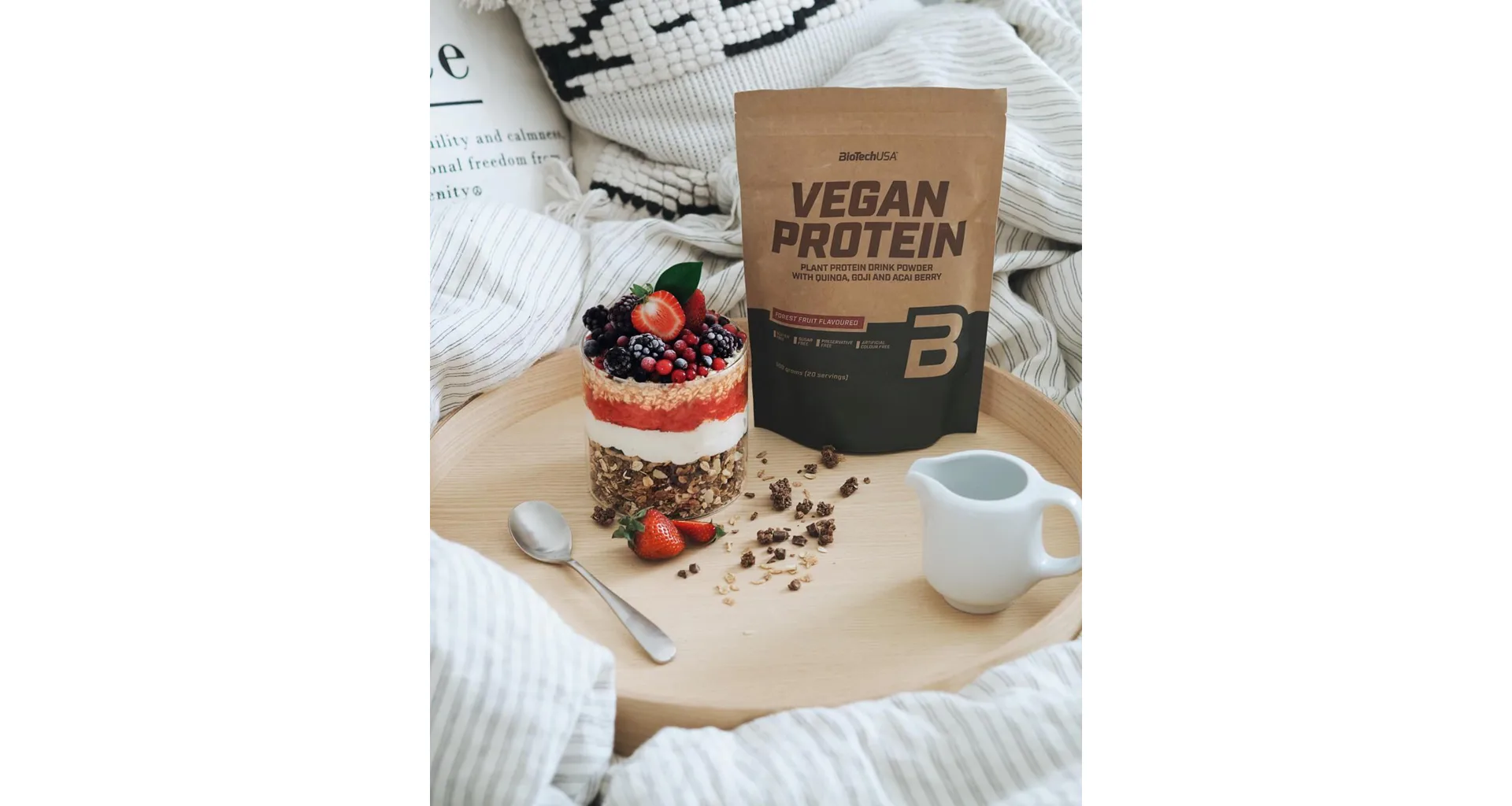 Lesné ovocie: hrachový proteínový izolát, ryžový proteín, L-glutamín, arómy, zvýrazňovač chuti (glycín a jeho sodná soľ), zahusťovadlá (karagenan, celulózová guma), L-arginín, emulgátor: sójový lecitín, múka z quinoiy 1,6%, prášok z bobúľ goji 1,1%, kyselina (kyselina citrónová), prášok z bobúľ Acai 0,6%, soľ, sladidlo (sukralóza).