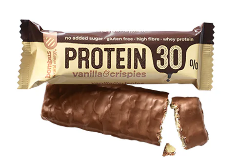 Proteínová tyčinka BOMBUS PROTEIN 30% je rýchly snack s vysokým obsahom bielkovín, ktoré sú dôležité pre rast a udržanie svalovej hmoty. Je prirodzene bez lepku, poteší vás vysokým obsahom vlákniny, nízkym podielom cukrov a minimálnym množstvom použitých ingrediencií. Je vhodná pre vegetariánov, celiakov a všetkých, ktorí túžia doplniť bielkoviny chutnou desiatou.