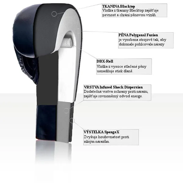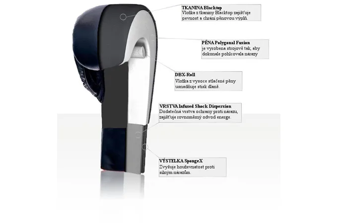 Chrbtová časť rukavice je vyplnená špeciálnou obmenou pamäťovou penou, ktorá dokonale pohlcuje údery aj počas dlhšieho a intenzívnejšieho tréningu ako na boxovacom vreci, tak na terči či pri tréningu sa sparing partnerom. Bezpečnosť rukavíc zaisťuje pásik so suchým zipsom pre spevnenie zápästia a priestor pre palec spojený remienkom so zvyškom rukavice, tieto prvky minimalizujú možnosť zranenia.
