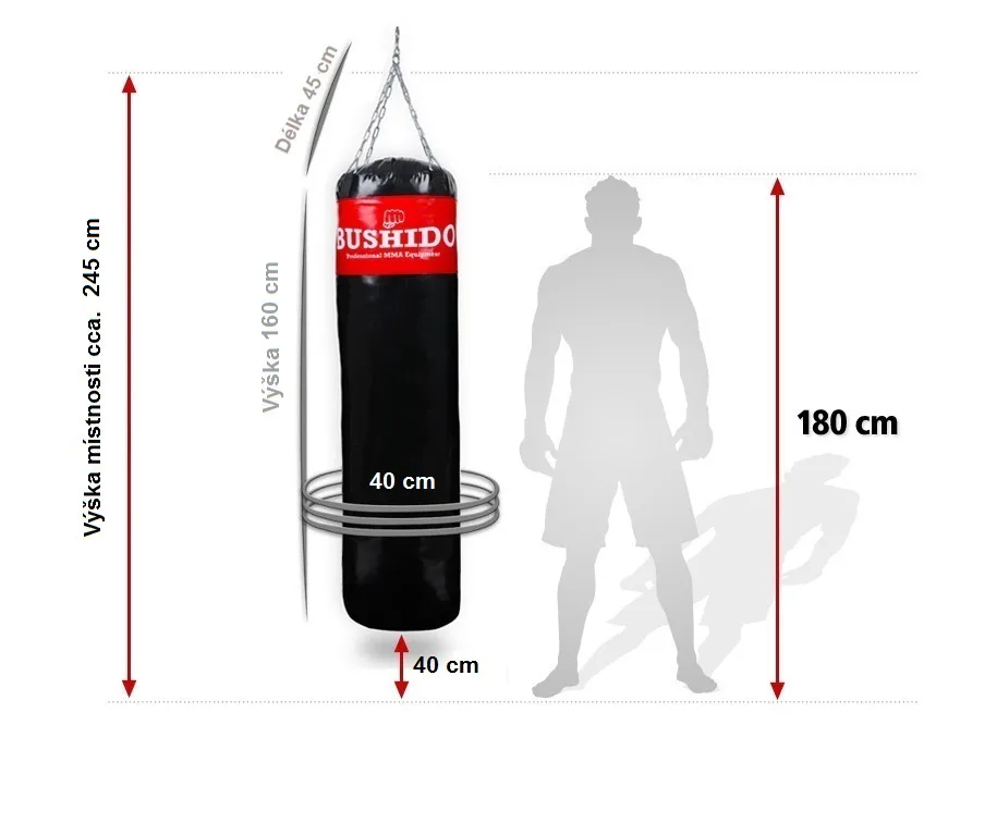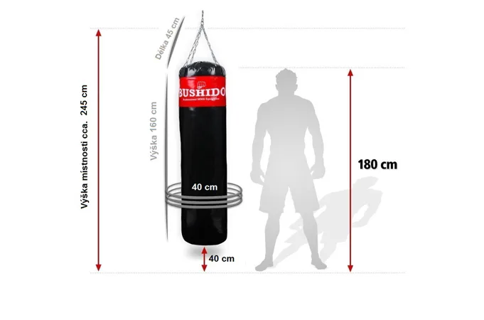 Profesionálne boxovacie vrece DBX BUSHIDO 160 x 40 cm. Dĺžka reťazí pri zavesení 45 cm (vďaka karabíne je možné nastaviť aj kratšiu dĺžku). Je vyrobený z patentovaného 7-vrstvového materiálu s výbornou odolnosťou.