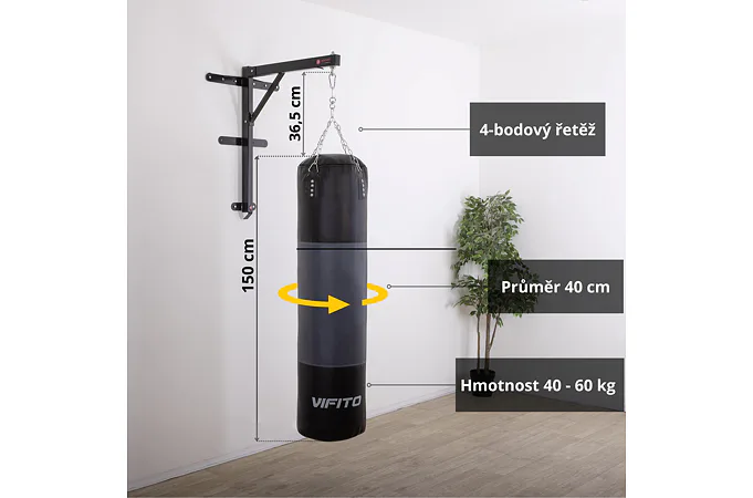 VIFITO Vario se snadno zavěšuje pomocí závěsného řetězu s karabinou, který je součástí balení. Tento pytel je dokonalým pomocníkem pro trénink boxu, bojových umění nebo kondičního cvičení. Přídavná závaží ani držák (šibenice) nejsou součástí dodávky, můžete si je u nás dokoupit!