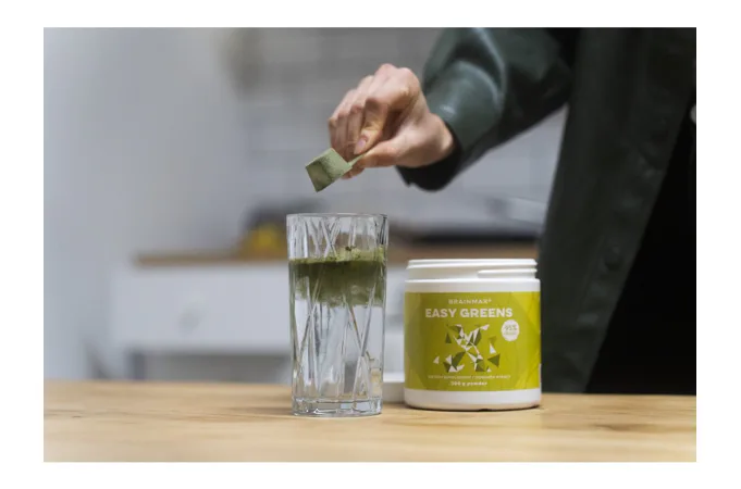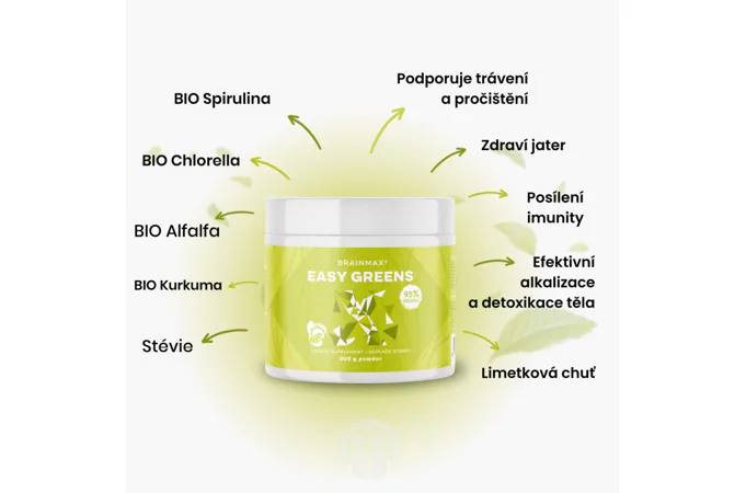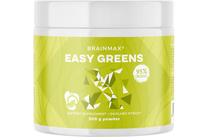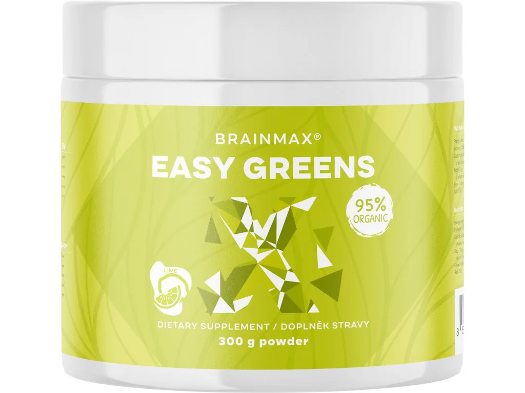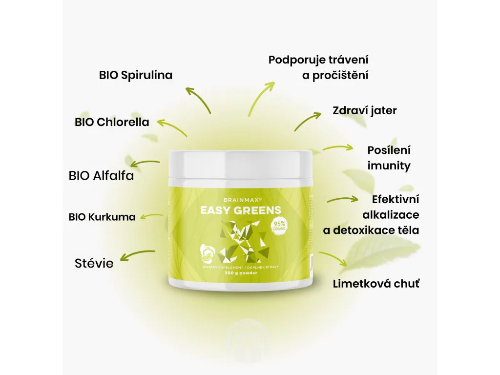 Vyvážený mix zelených BIO potravín Easy Greens. Nápoj, ktorý si vďaka organickému pôvodu ingrediencií a šetrnému spôsobu spracovania zachováva vitamíny a minerály. Je určený na alkalizáciu a detoxikáciu tela, na lepšie trávenie, činnosť pečene, prečistenie, na posilnenie energie a vitality, optimálnu hladinu cholesterolu v krvi, hladine cukru v krvi a prirodzenej obranyschopnosti organizmu. Základ tvorí spirulina, chlorella a alfalfa, doplnené o kurkumu, stéviu a citrónovú trávu.