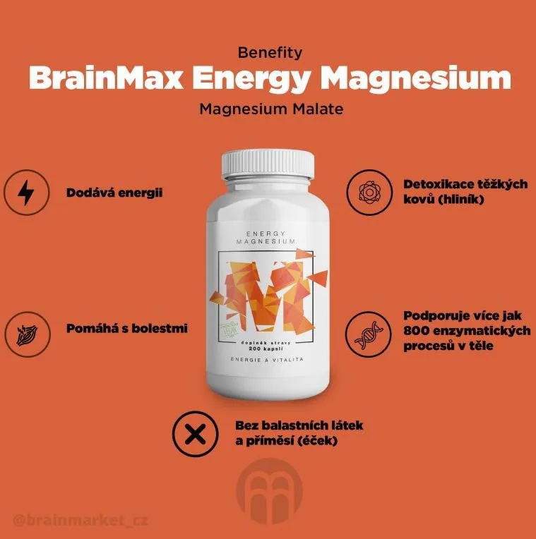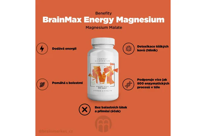 BrainMax Energy Magnesium, 1000 mg, 200 kapsúl (Magnesium Malate - Horčík malát, 164 mg)