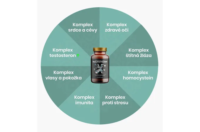 Multivitamín je vhodný na zníženie fyzického i psychického vyčerpania 5, 11, 10, zmiernenie stresu 3. Sú tu špeciálne navrhnuté komplexy super látok pre podporu imunity, kardiovaskulárneho a reprodukčného systému, zdravia prostaty, štítnej žľazy, očí, kostí, zubov, svalov, vlasov , pleti, podporu potencie, energie, odolnosti na stres a v neposlednom rade riešenie homocysteínu.