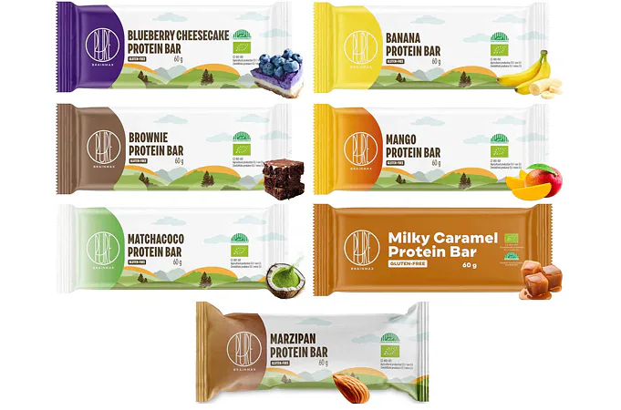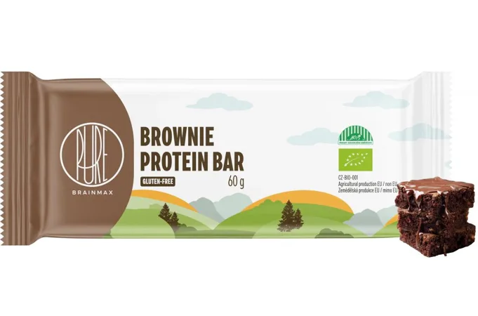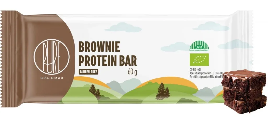 Brownie: (23 %) zmes proteínov (srvátkový proteín*, mliečny proteín*), (17 %) horká čokoláda* (kakaová hmota, trstinový cukor kakaové maslo, emulgátor: sójový lecitín, vanilkový extrakt), čakankový sirup, kešu kakaová hmota*, zvlhčujúca látka: glycerol*, kakaové maslo*, sladidlo: erytritol*. *produkt z ekologického poľnohospodárstva. Minimálna trvanlivosť (číslo šarže) na zadnej strane obalu.