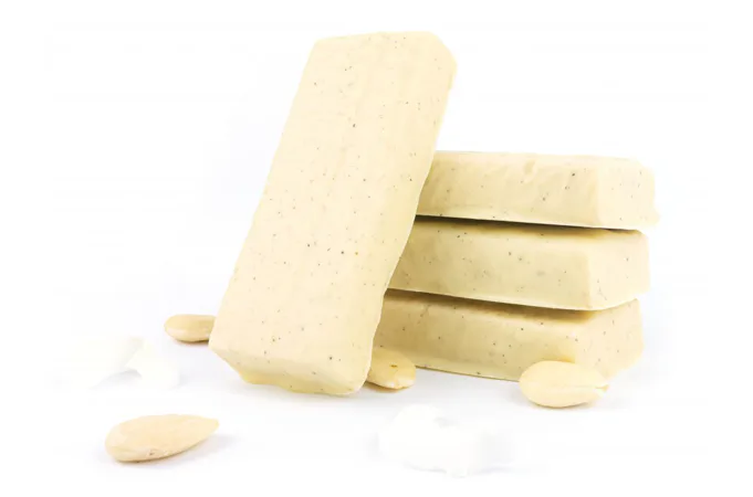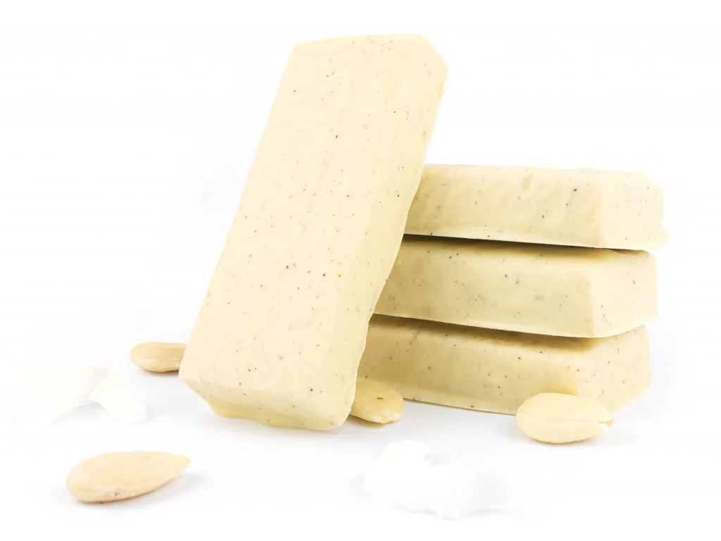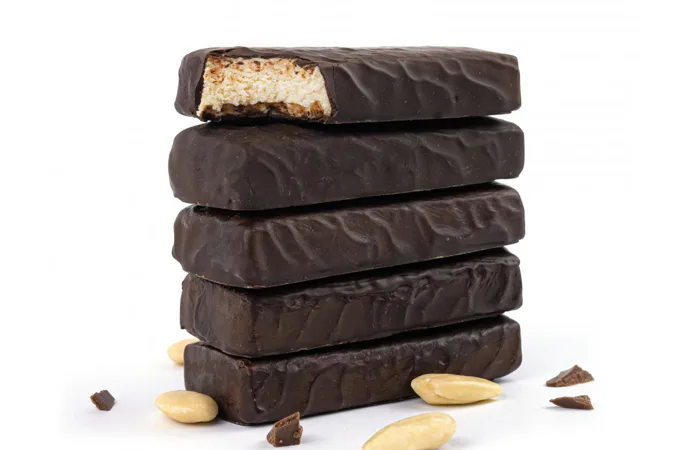Kokos: (23 %) zmes proteínov (srvátkový proteín*, mliečny proteín*), kukuričná vláknina*, (16 %) biela čokoláda* (trstinový cukor*, kakaové maslo*, sušené mlieko*, emulgátor: sójový lecitín*, vanilkový *, vanilka*), mandľový krém*, (8 %) kokos*, zvlhčujúca látka: glycerol*, kokosový olej*, sladidlo: erytritol*, prírodná aróma.