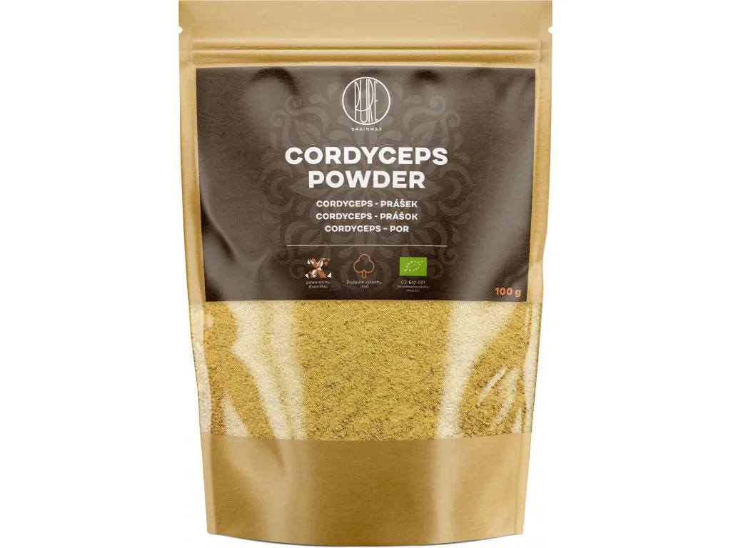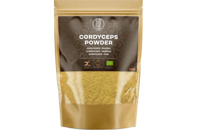BIO Prášok z plodnice Cordyceps sinensis. Neobsahuje, kofeín, lepok, konzervačné látky, farbivá ani cukor.