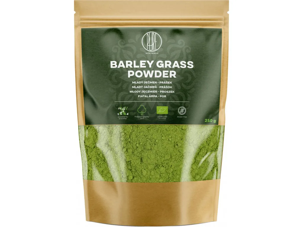 BrainMax Pure Mladý jačmeň pochádza listov mladých rastlín jačmeňa. Zberá sa v období pred výkvetom, pretože v tejto dobe obsahuje najviac cenných živín a neobsahuje lepok. Po zbere prechádza šťava z listov sušením a vďaka tomu si zachováva všetky cenné látky. Je pestovaný v súlade s ekologickým poľnohospodárstvom, neobsahuje žiadne pesticídy, herbicídy ani iné látky a nesie tak označenie BIO. Organický prášok z mladého jačmeňa je možné použiť ako prísadu do smoothies alebo jednoducho rozmiešať v pohári vlažnej vody spolu s citrónovou alebo limetkovou šťavou.
