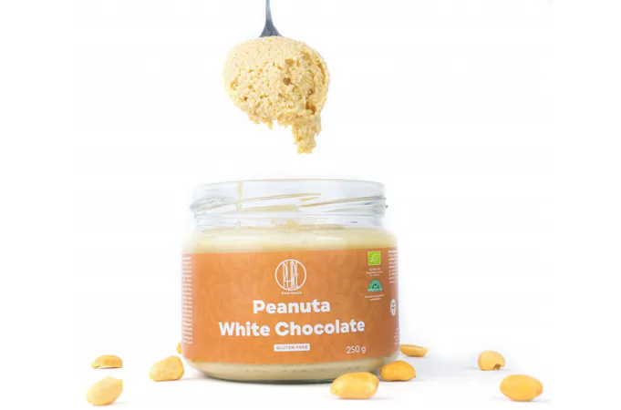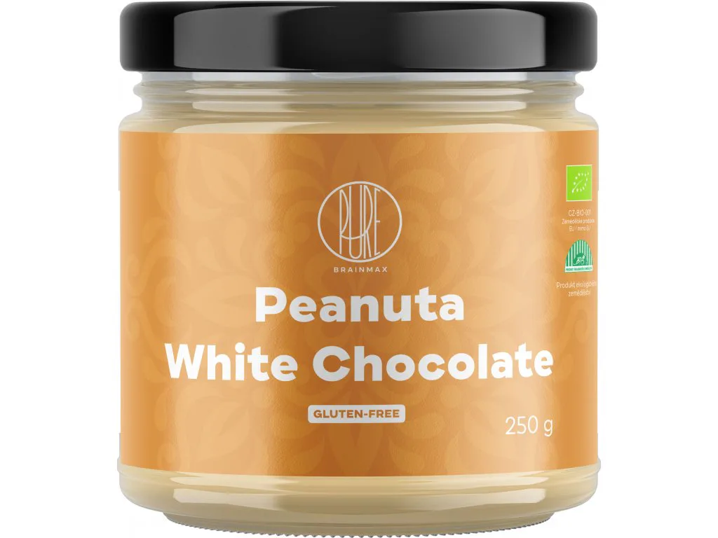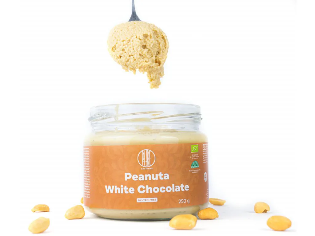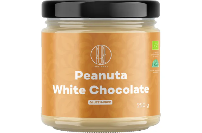 BrainMax Pure Peanut Butter White Chocolate, tvoria iba rozomleté organické arašidy a BIO biela čokoláda. Arašidový krém známy aj ako arašidové maslo, ktorý je doladený značnou porciou kvalitnej bielej čokolády. Krém má vynikajúcu chuť a taktiež dôležité makroživiny.