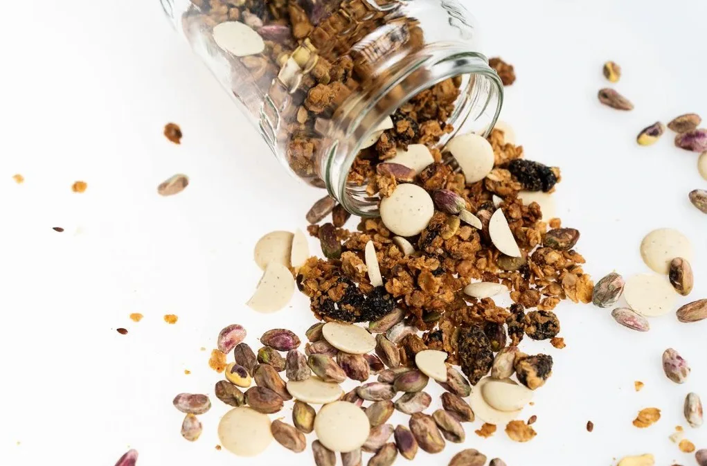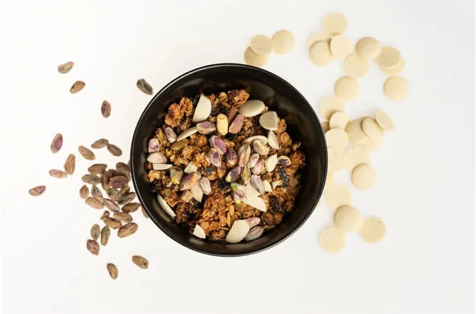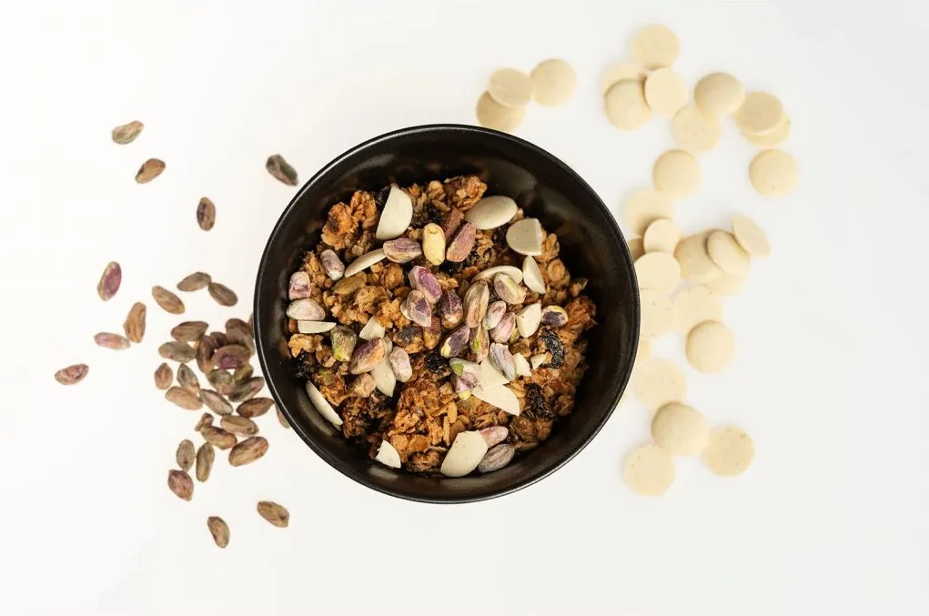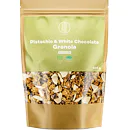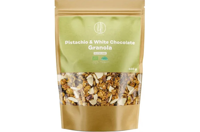 Chrumkavé kúsky granoly z bezlepkových BIO ovsených vločiek, ku ktorým sme pridali BIO pistácie. Tie sú zdrojom kvalitných tukov s vysokým obsahom nenasýtených mastných kyselín a vitamínov skupiny B. Pre sladšiu a jemnejšiu chuť sme granolu obohatili o kúsky bielej čokolády a nami vyrobený mandľový krém z BIO mandlí. Ako tuk tu slúži BIO ghí, ktoré má príjemnú maslovú vôňu s ľahkým orieškovým arómom. Navyše obsahuje zdravé omega 3 a 6 mastné kyseliny doplnené o látky udržiavajúce zásadité prostredie v tele. Obsahuje maslovú kyselinu, ktorá je dôležitá pre našu črevnú sliznicu.