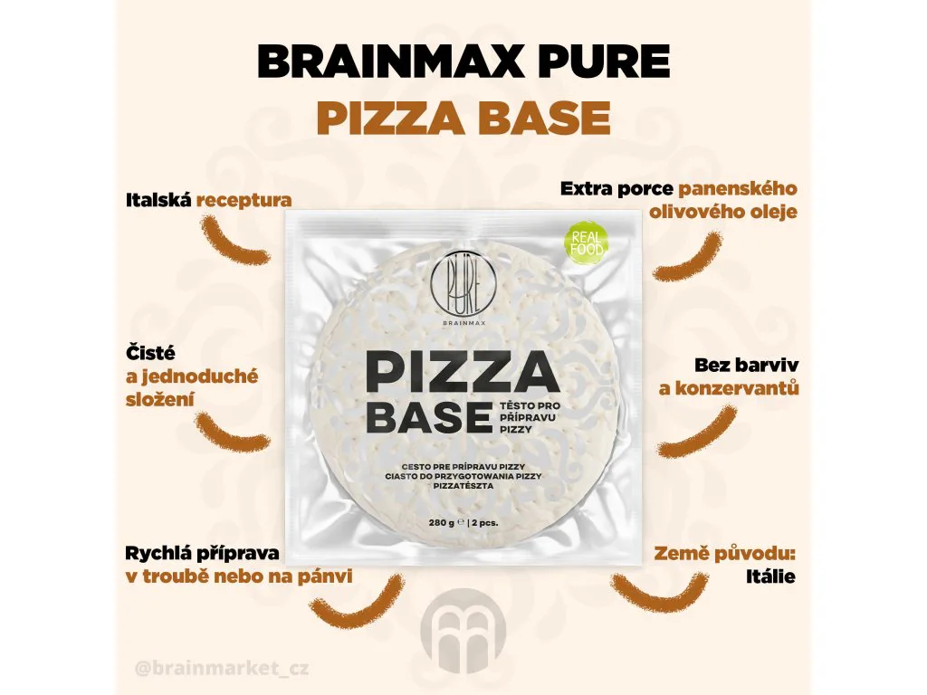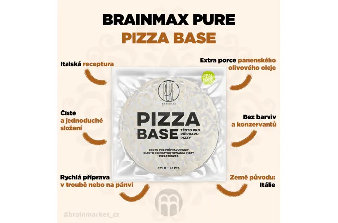BrainMax Pure Pizza Base hotové cesto na pizzu z Talianska, je perfektné na rýchlu prípravu dokonalého jedla. Základom cesta je kvalitná talianska múka s panenským olivovým olejom a kváskom podľa jedinečnej talianskej receptúry.