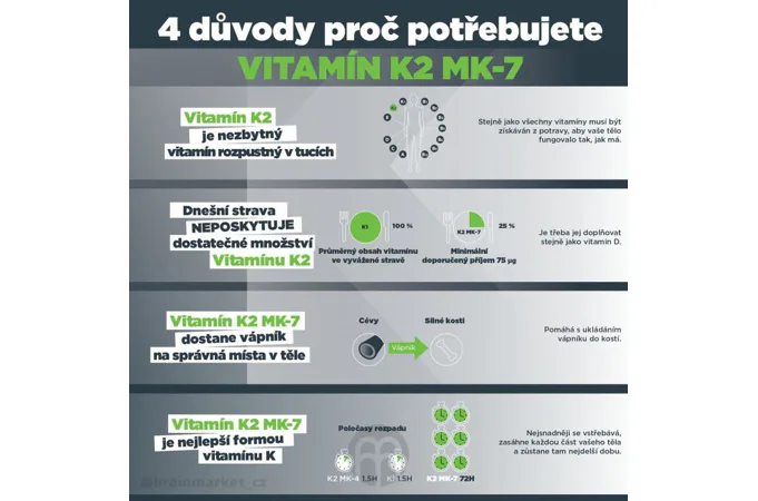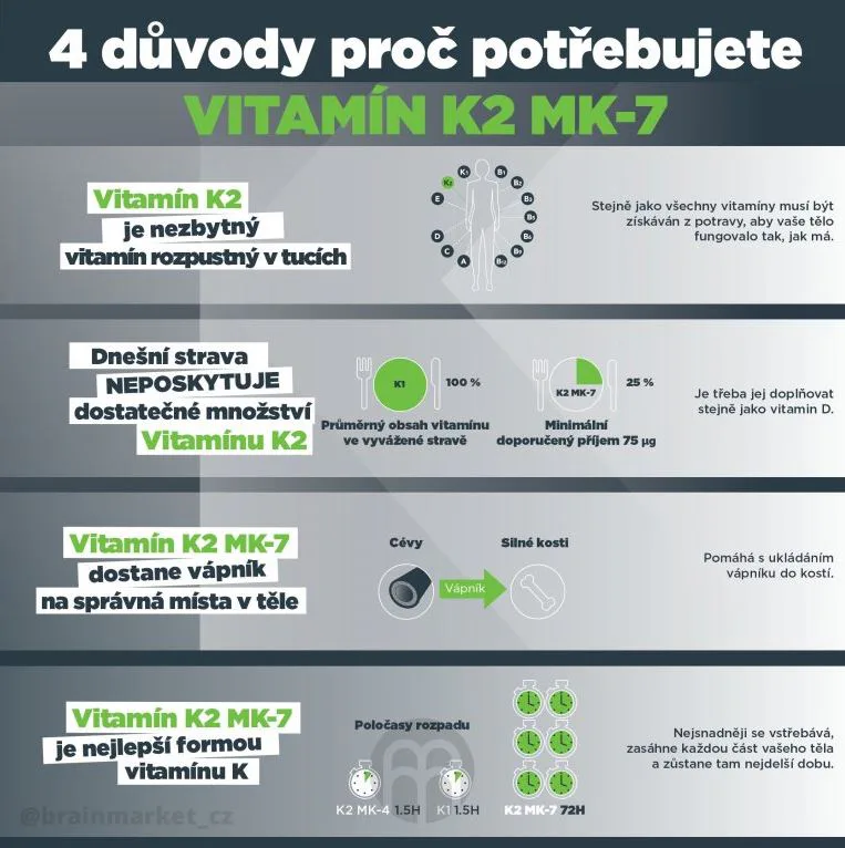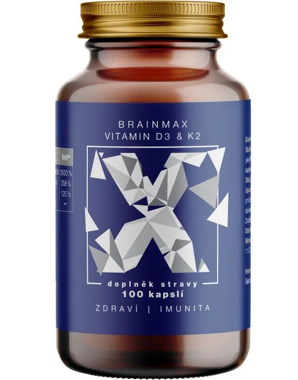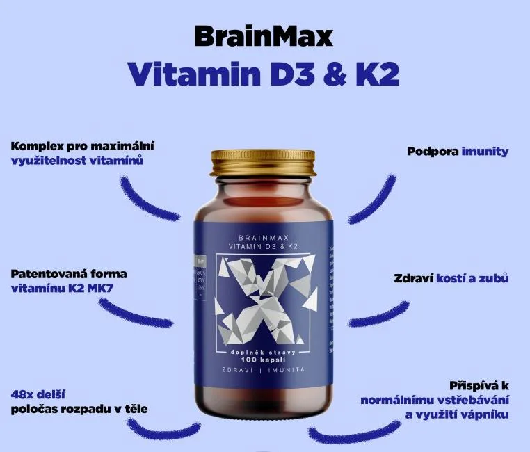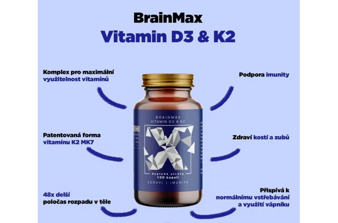 BrainMax Vitamín D3 & K2 kombinuje vitamíny D3 a K2 ako MK7, dve mikro živiny, ktoré boli rozsiahle skúmané pre svoju úlohu v zdraví kostí, zubov a kardiovaskulárneho systému. Vitamín D3 podporuje ukladanie vápnika do kostí, čím zlepšuje zdravie kostí. S vyšším príjmom vitamínu D3 môže súvisieť ukladanie vápnika do ciev (kalcifikácia ciev). Z tohto dôvodu sme k vitamínu D3 pridali vitamín K2 ako MK7, ktorý čistí cievy od vápnika a pomáha ukladať vápnik do kostí. Je to binárna zbraň, úplná synergia dvoch esenciálnych vitamínov, ktoré sú dôležité pre celkové zdravie. Vitamín D3 si naše telo v lete vytvorí zo slnečného žiarenia, ale vitamín K2 môžeme prijímať iba z potravy. Dosiahnuť však jeho požadovanú dennú potrebu je prakticky nemožné.