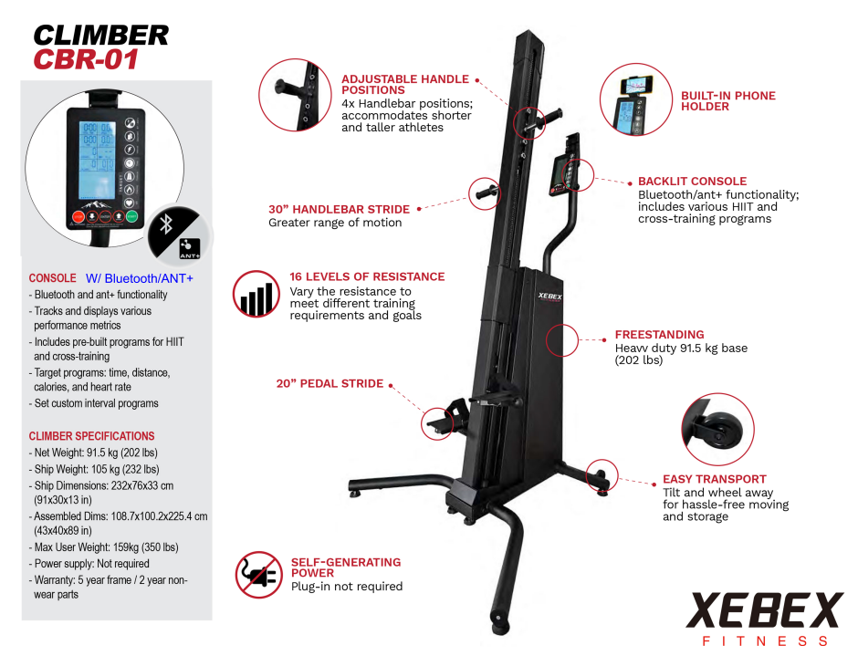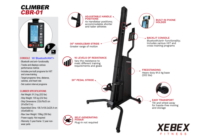 Pokud už vás nebaví tradiční trénink a neustálé běhání na běžeckém pásu či šlapání na rotopedu, tak pro vás máme tu nejefektivnější variantu, která odstartuje zcela novou kapitolu vaší tělesné transformace. Tento trenažér ocení každý začínající, ale i profesionální sportovecJedná se o světově populární Climber XEBEX Vertical, který zapojí každý sval na vašem těle v každém momentu. Tento populární trenažér se využívá s velkou oblibou především v bojových a crossfit kolektivních cvičeních s důrazem na HIIT trénink a vybraných intervalových režimů.Trenažér disponuje stabilní základnou a určen pro všechny tělesné výšky. Na přehledném podsvíceném LCD monitoru si můžete kontrolovat údaje o tréninku a ovládat climber 16 úrovněmi odporu.Délka kroku je 50 cm a délka pohybu řídítek může být až 70 cm. Řídítka mají 4 úrovně nastavení a navíc k trenažéru můžete dokoupit řadu tréninkových doplňků, které udělají váš trénink ještě pestřejší.