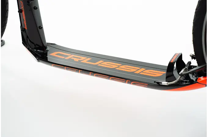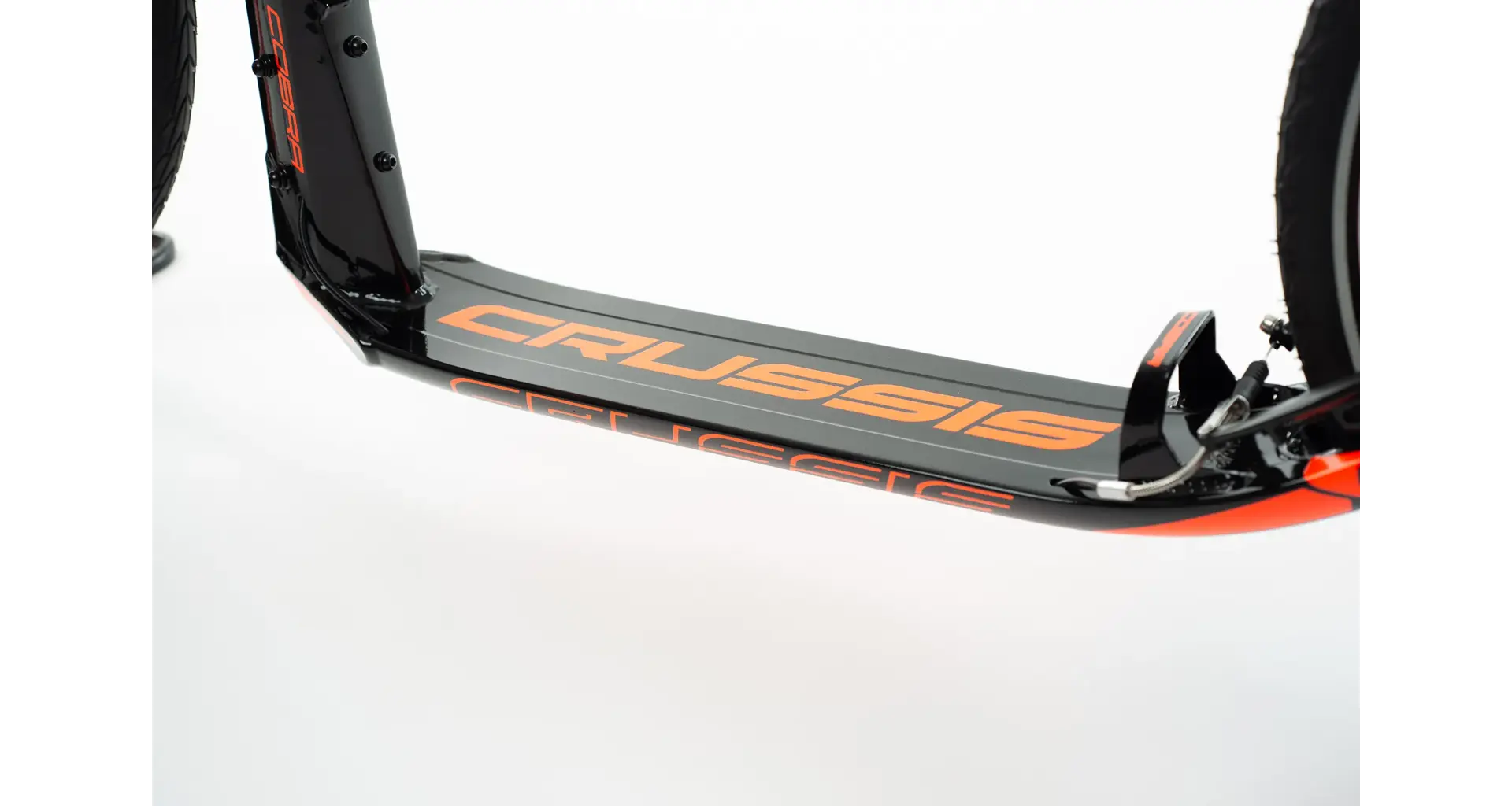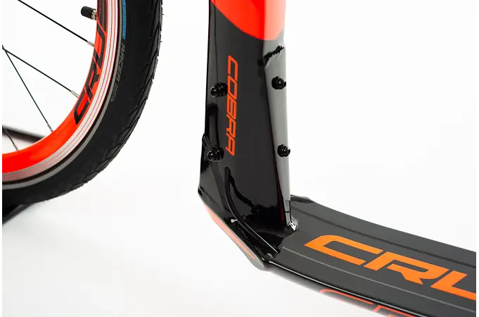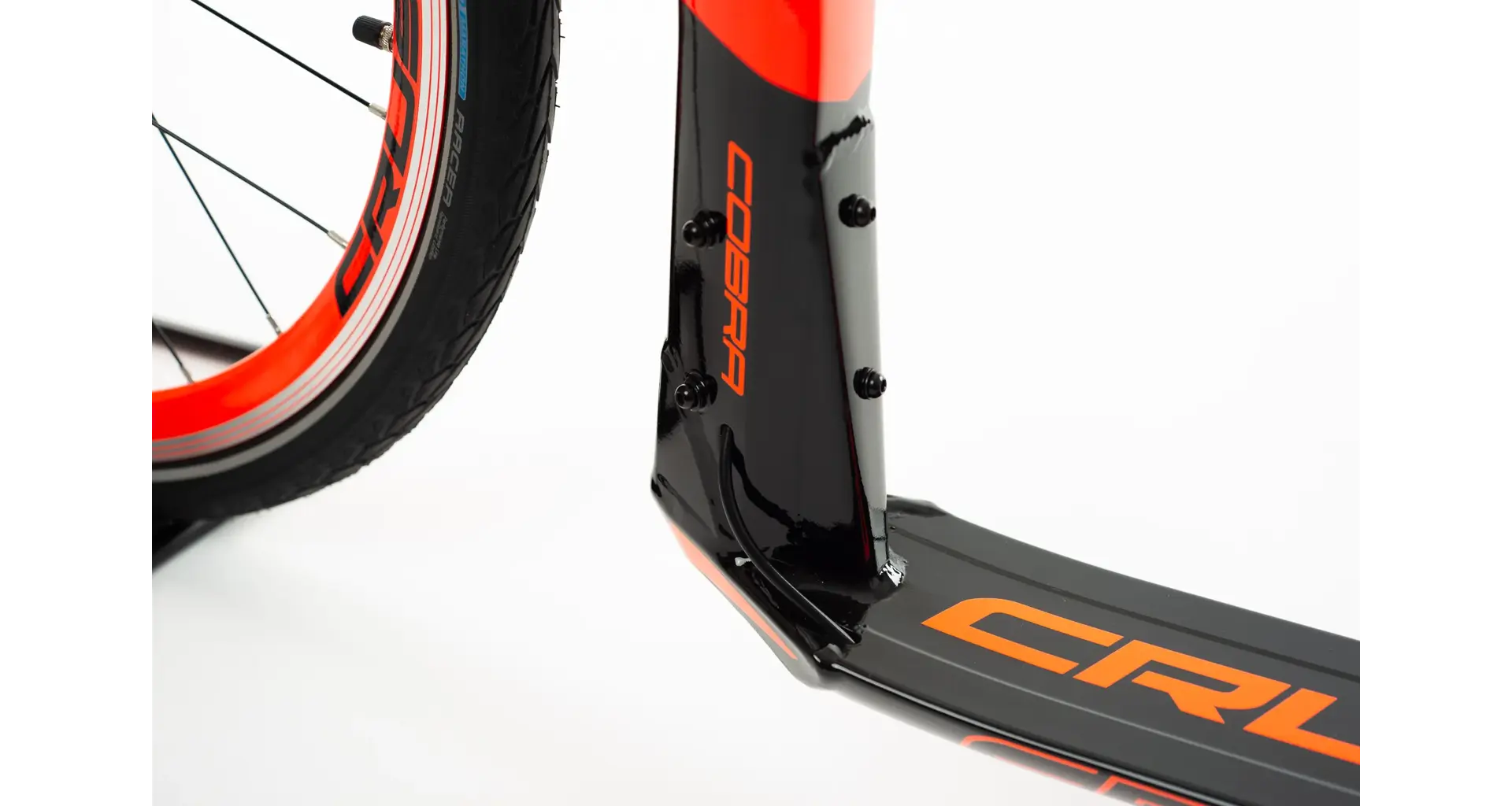 Unikátní hliníkový rám koloběžek Crussis Cobra byl vyvinut tak, aby se zadní vidlicí tvořil jeden celek. To eliminuje únavové lomy v místech, kde je vidlice ke stupátku obvykle přivařena. Kónický tvar hlavové trubky spolu s trojúhelníkovým profilem krku zvyšuje pevnost rámu.