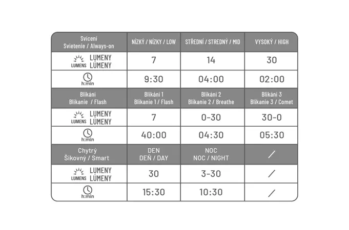 Vďaka svetelnému kužeľu v rozsahu 230° budete vidieť až na vzdialenosť 800 metrov. Obe svetlá zo sady Crussis CRS 30 majú viac režimov svietnikí vrátane režimu nízskej spotreby.