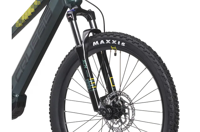 Crussis e-Atland 6.10 je vybaveno odpruženou vidlicí s pružinovým tlumením SUNTOUR XCM32 NLO DS 29" se zdvihem 100 mm, která je skvěle přizpůsobivá váze cyklisty.