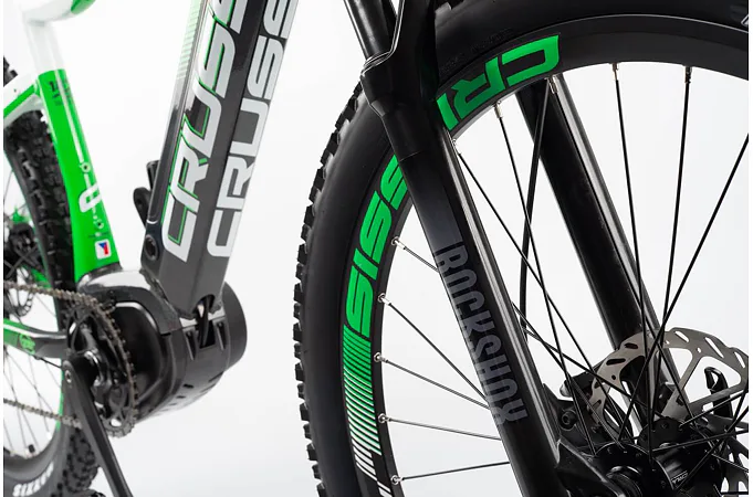 CRUSSIS e-Atlanda 8.7 je vybaveno odpruženou vidlicí s pružinovým tlumením ROCKSHOX FS Judy Silver TK Solo Air 27,5" se zdvihem 100 mm, která je skvěle přizpůsobivá váze cyklisty.